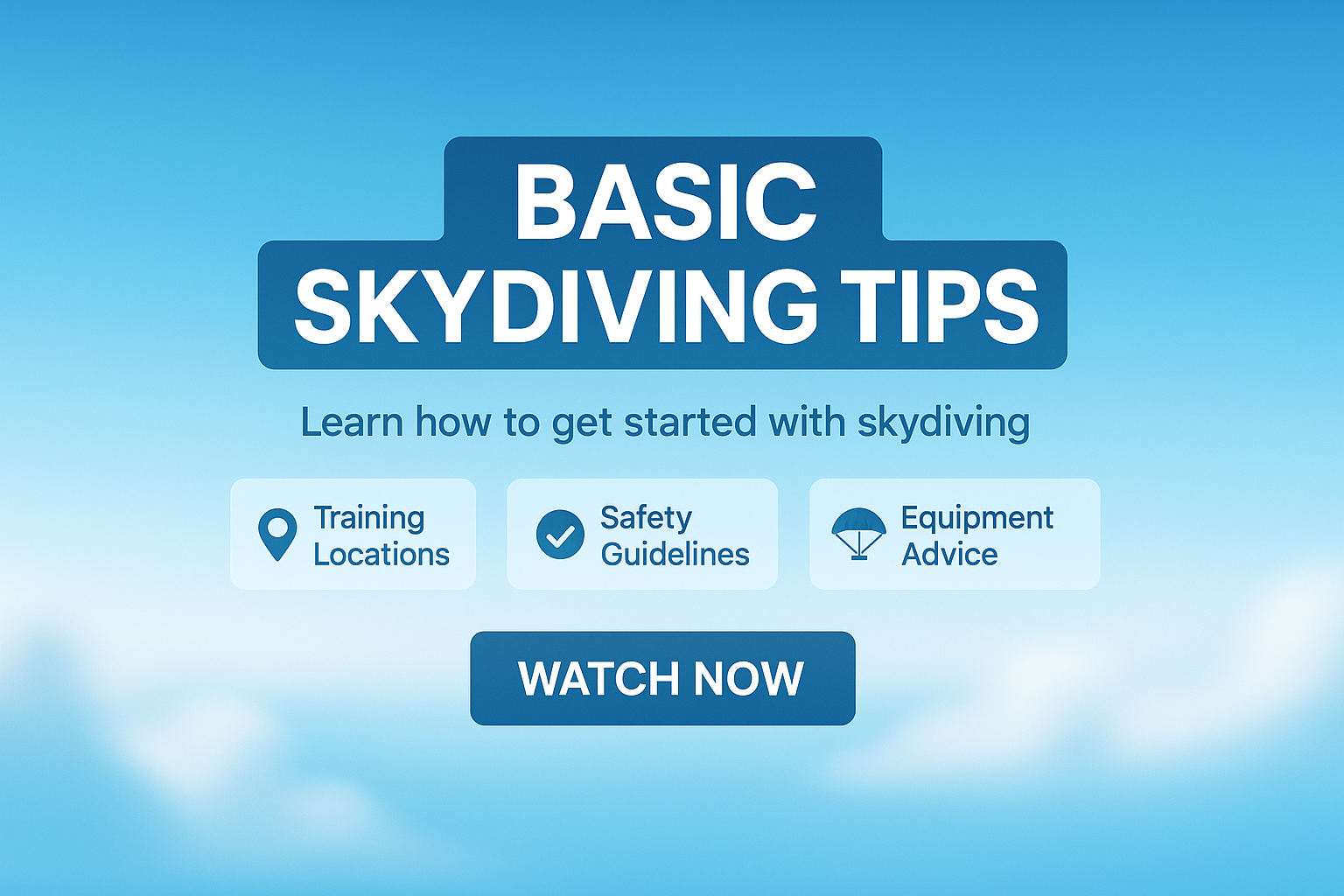 Engaging digital graphic designed to provide basic skydiving tips, featuring a clean layout and a serene sky background, ideal for beginner skydivers and promotional content.