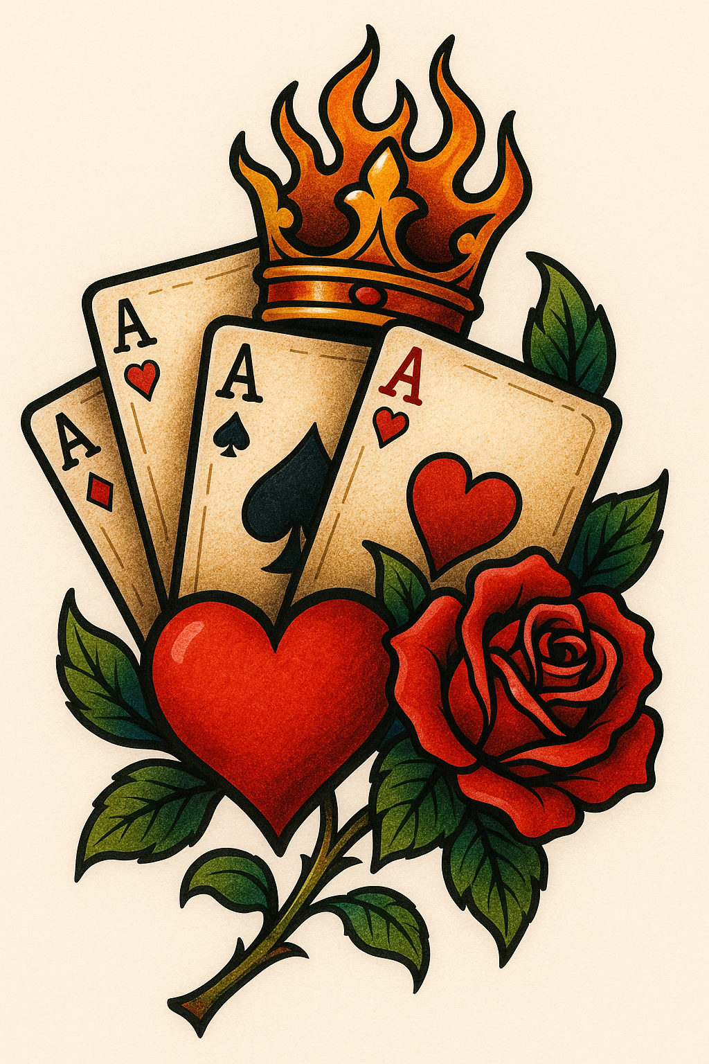 Vibrant tattoo illustration depicting three aces, a crown, and a red rose, symbolizing luck and love. Ideal for tattoo enthusiasts and design inspiration.