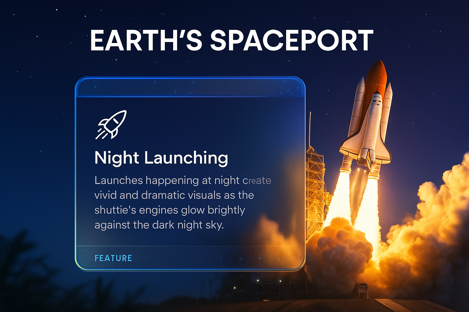 /Collection: /by davooda/Type: PNG/A breathtaking view of a shuttle launching at night, with vivid flames and smoke illuminating the dark sky. The foreground features a sleek, transparent information block highlighting launch details.