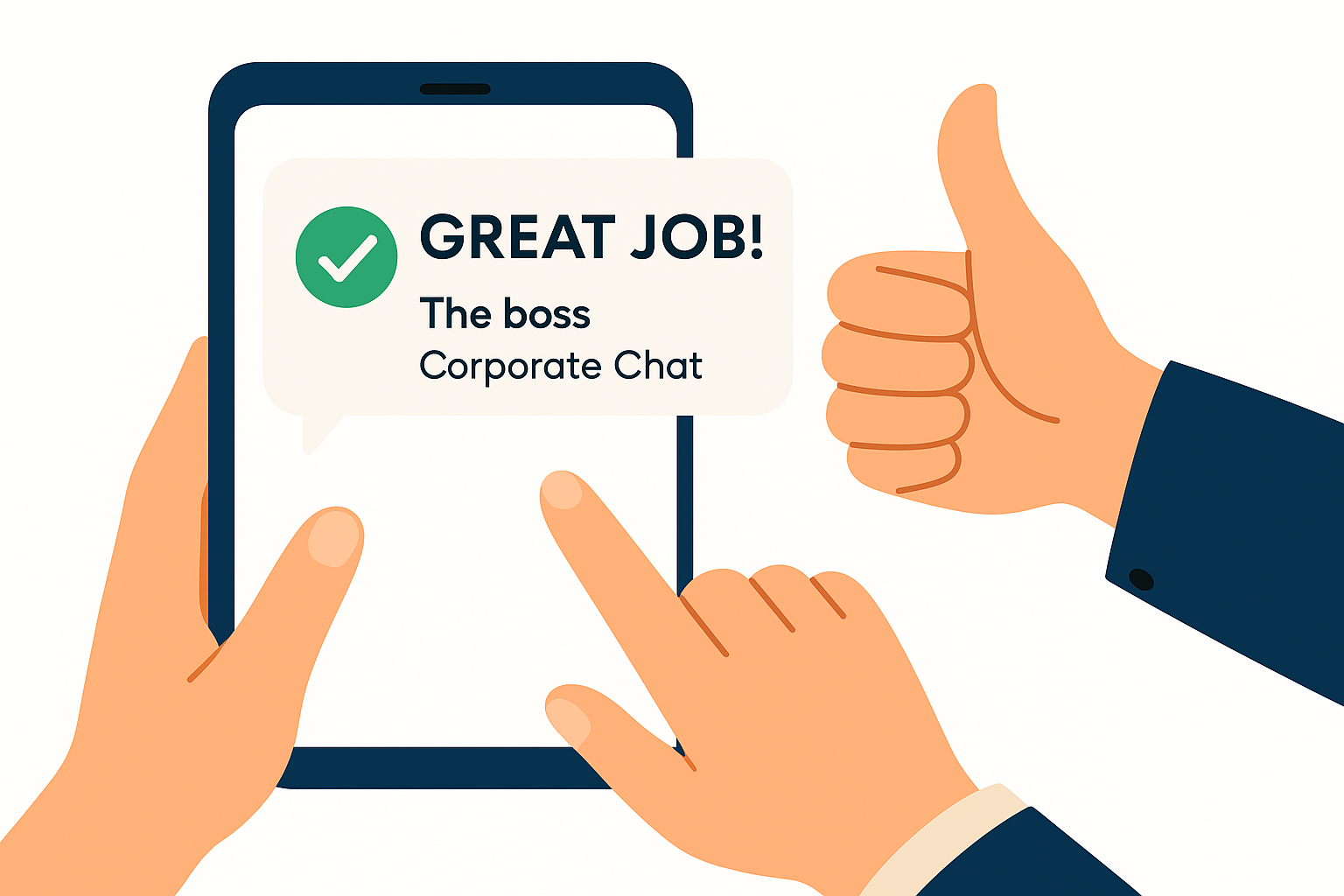A digital illustration depicting a mobile device showing a chat message of praise. The visual style is modern and friendly, suitable for workplace communication themes.