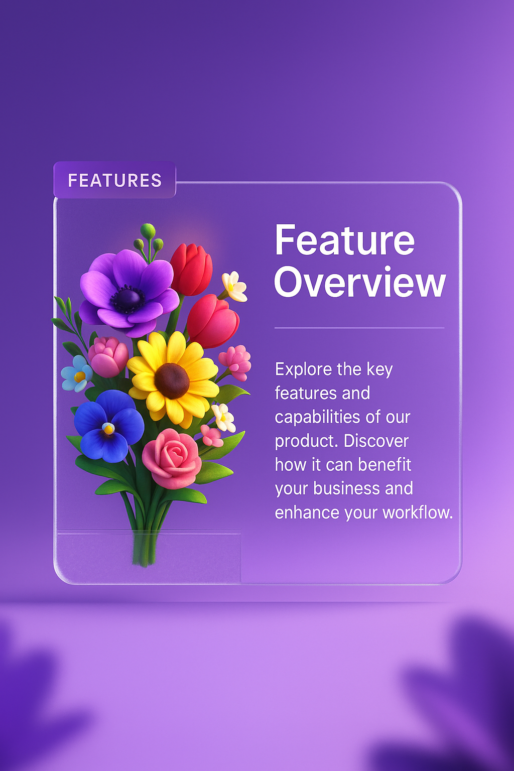 A vibrant 3D illustration of a colorful flower bouquet set against a smooth gradient background. The design includes a transparent block showcasing features and capabilities.