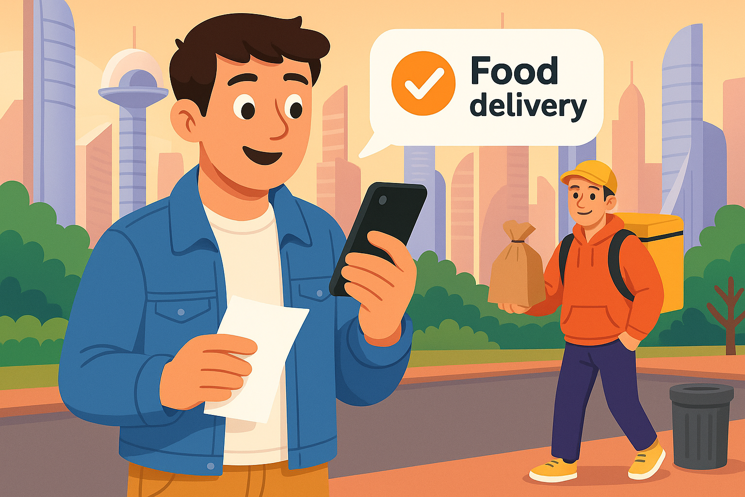 A vibrant illustration depicting a food delivery scenario, showcasing a satisfied customer and a delivery person, ideal for promotional materials related to food services.