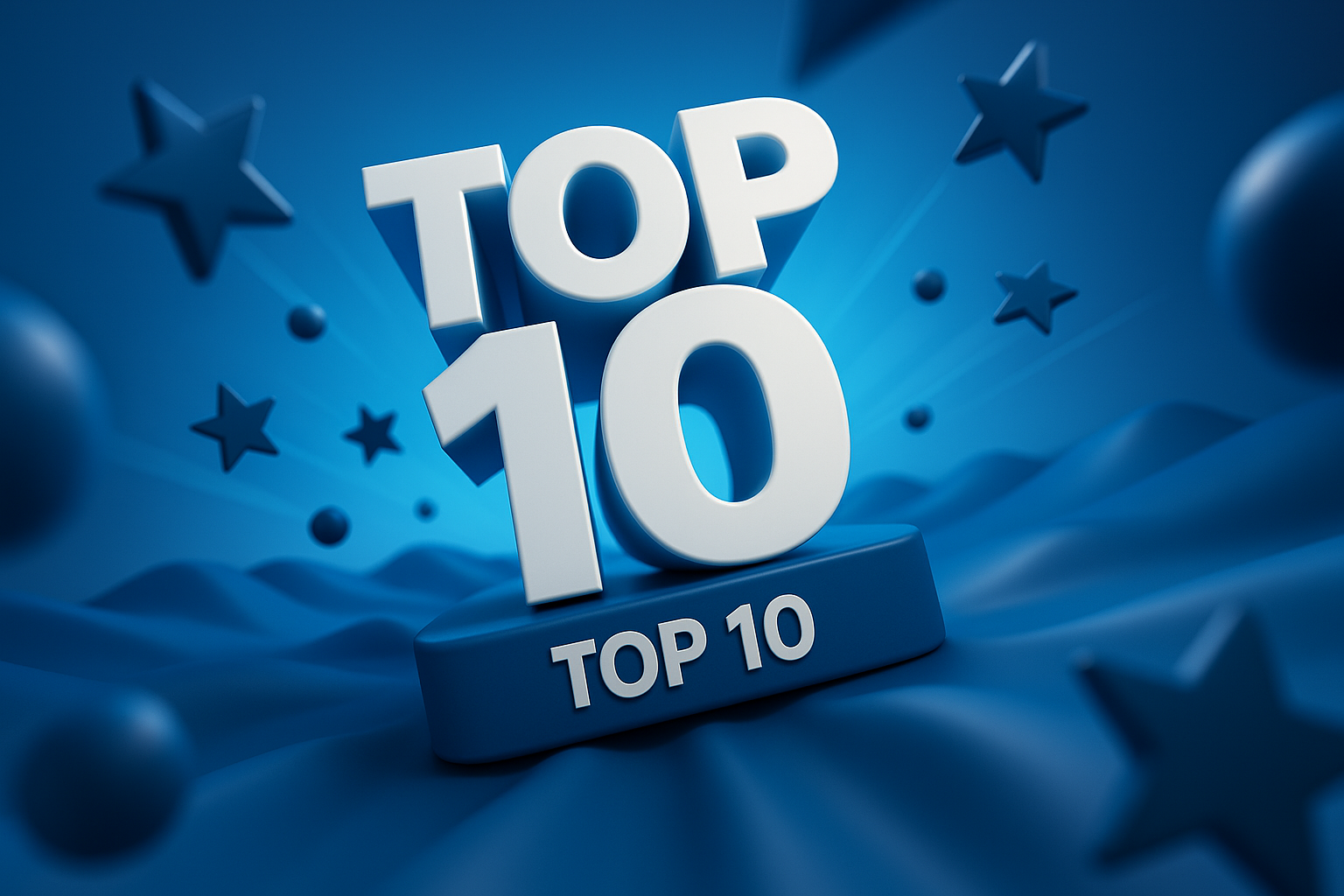 /Collection: /by davooda/Type: PNG/This image features a vibrant 3D representation of a 'Top 10' ranking, set against a dynamic blue background with stars and bubbles. Ideal for award promotions or ranking lists.