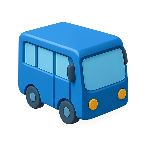 A playful, 3D-rendered blue bus icon featuring rounded edges and minimalistic design, ideal for children's apps or transportation-related graphics.