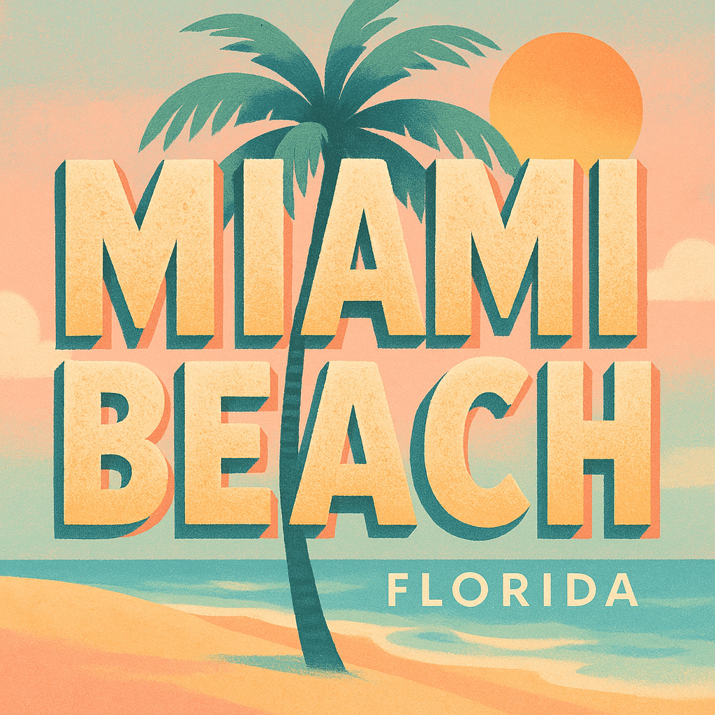 Vibrant retro-style graphic depicting Miami Beach with a palm tree and sunset, perfect for travel promotions or tourism marketing.