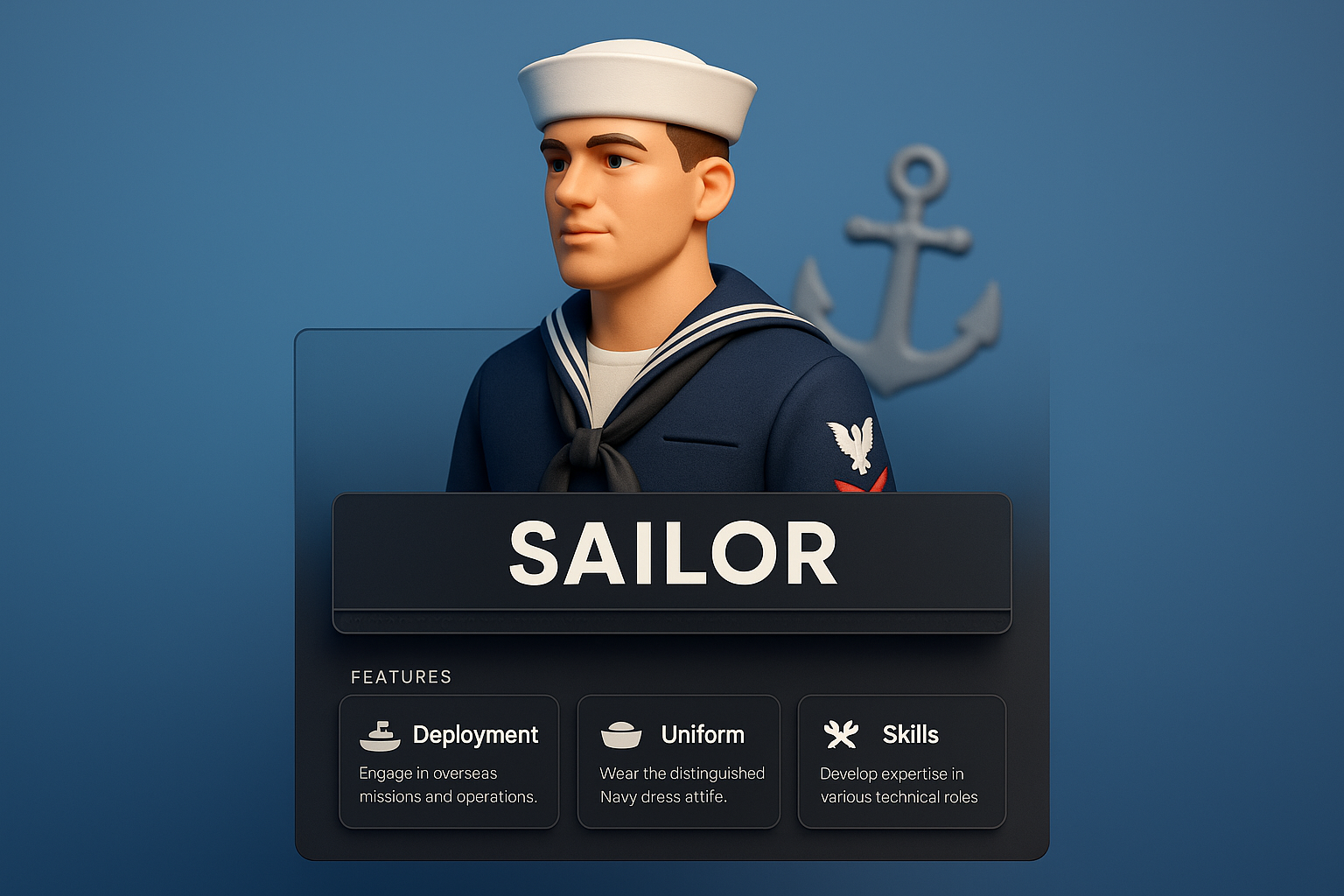/Collection: /by davooda/Type: PNG/A detailed 3D illustration of a sailor in Navy attire, featuring a dark overlay with distinct blocks that highlight key attributes like Deployment, Uniform, and Skills.