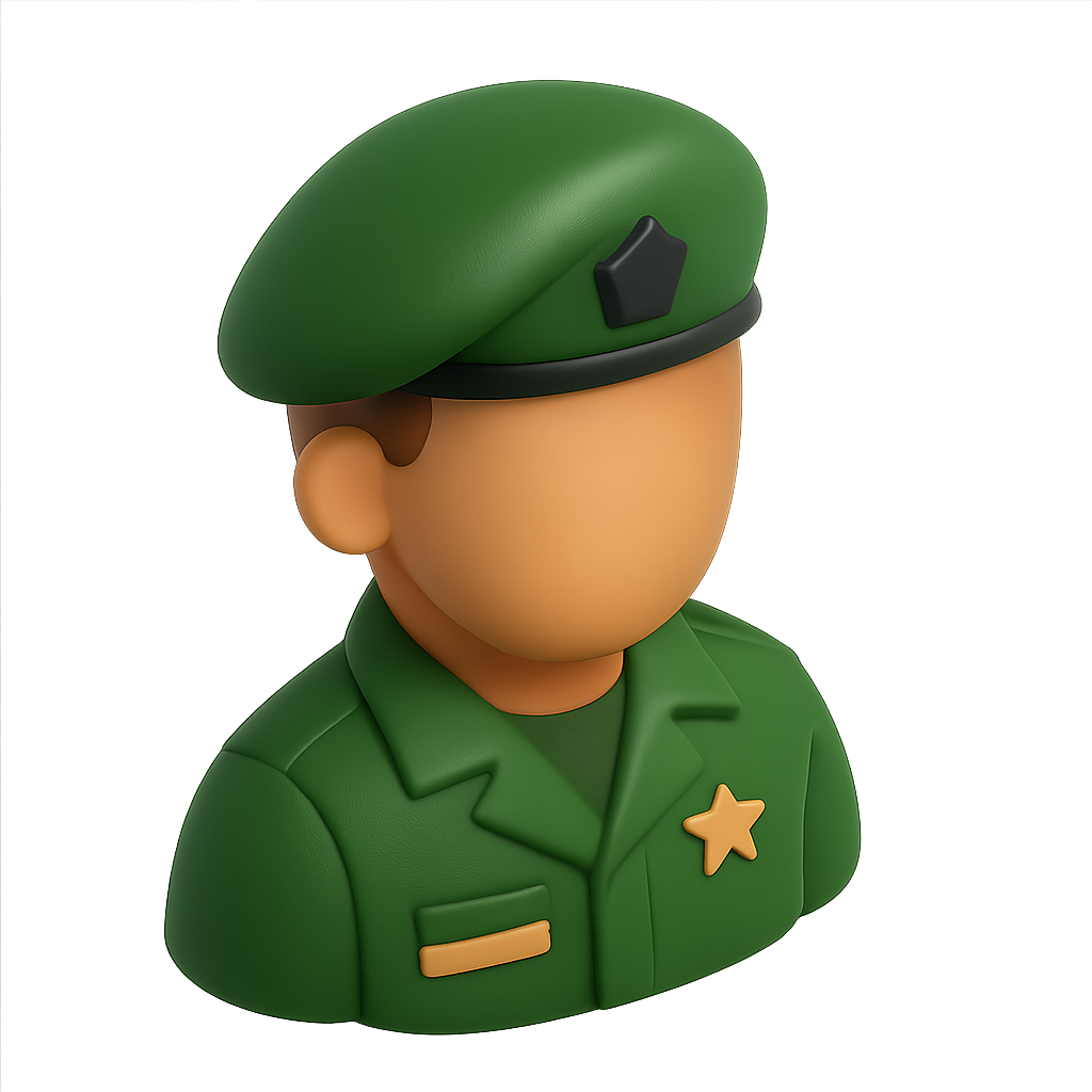 A stylized 3D icon of a green beret soldier, depicted in an isometric view with a smooth, rounded design. The figure features a green uniform and a distinctive beret, set against a blurred background.