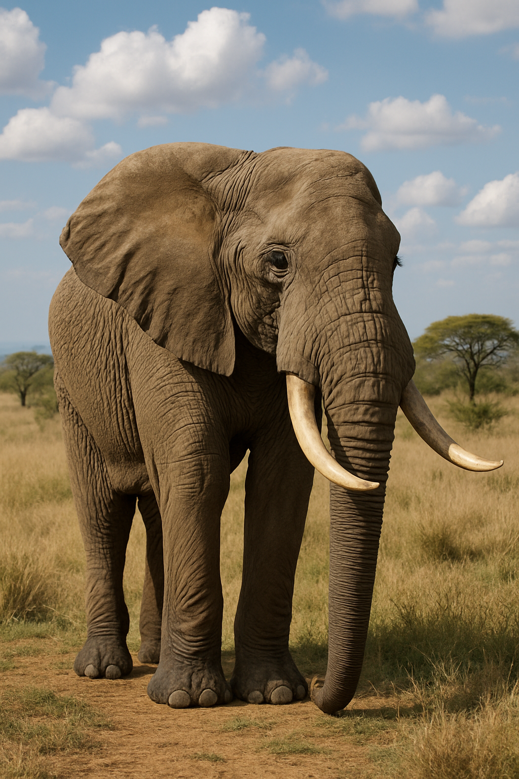 A striking photograph of an African elephant standing in a grassy landscape, showcasing the beauty of wildlife in its natural environment. Ideal for nature documentaries and wildlife conservation campaigns.