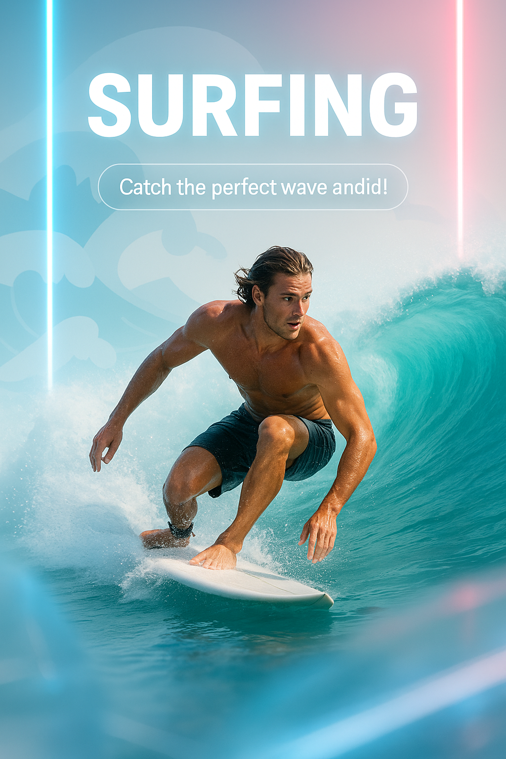 Dynamic Surfing Promotional Graphic Featuring a Surfer