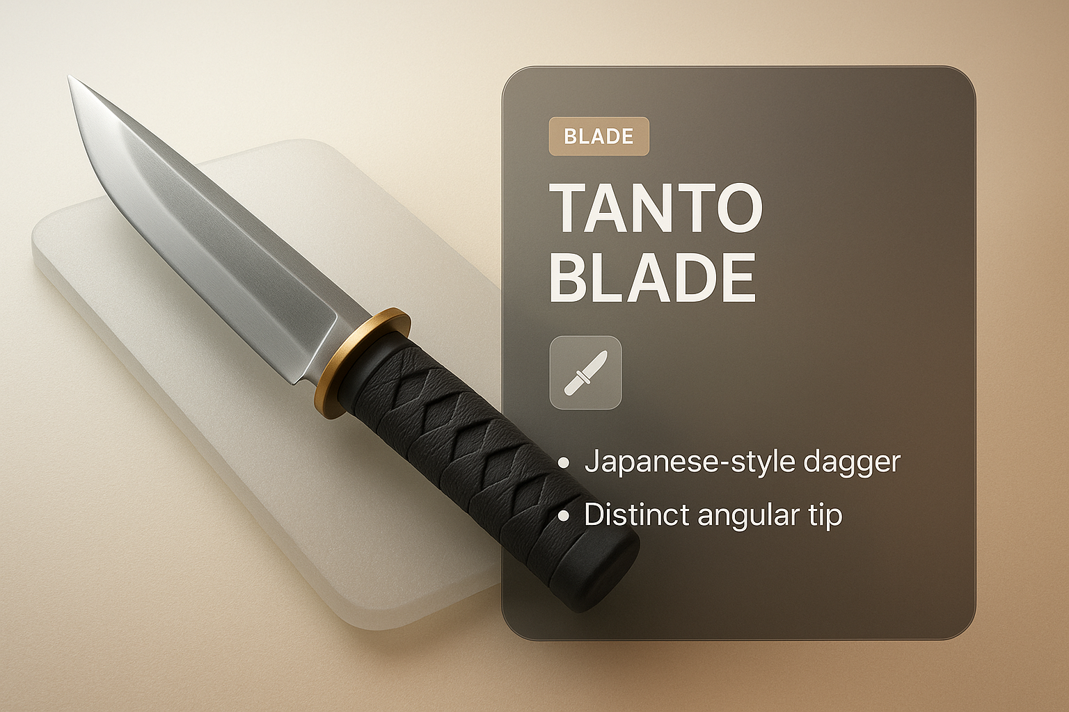 A visually striking 3D representation of a tanto blade, featuring a sleek design and distinct angular tip. The background has a soft gradient, enhancing the overall aesthetic.