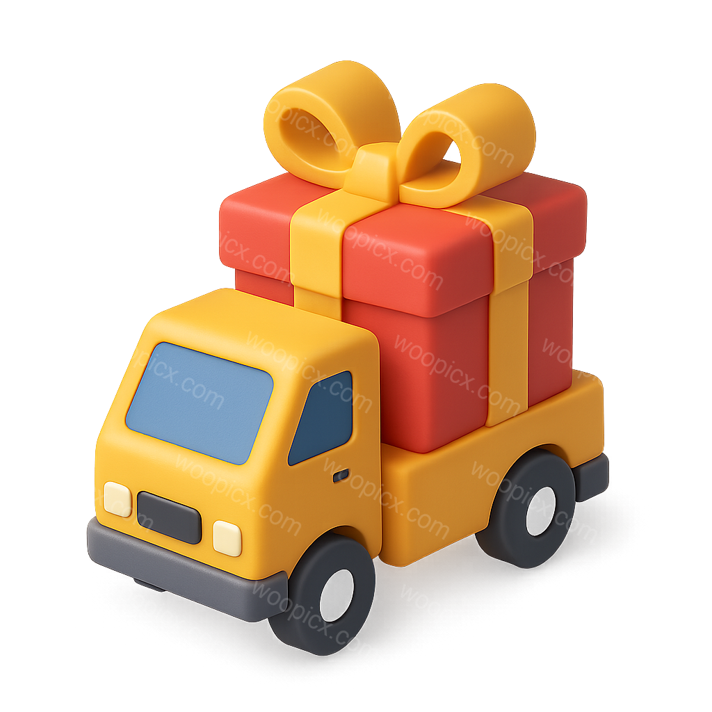 /Premium/Collection: /by davooda/Type: PNG/A vibrant 3D illustration of a delivery truck carrying a large gift box, featuring a red box with a yellow ribbon. The truck is stylized with a playful design and a transparent background.