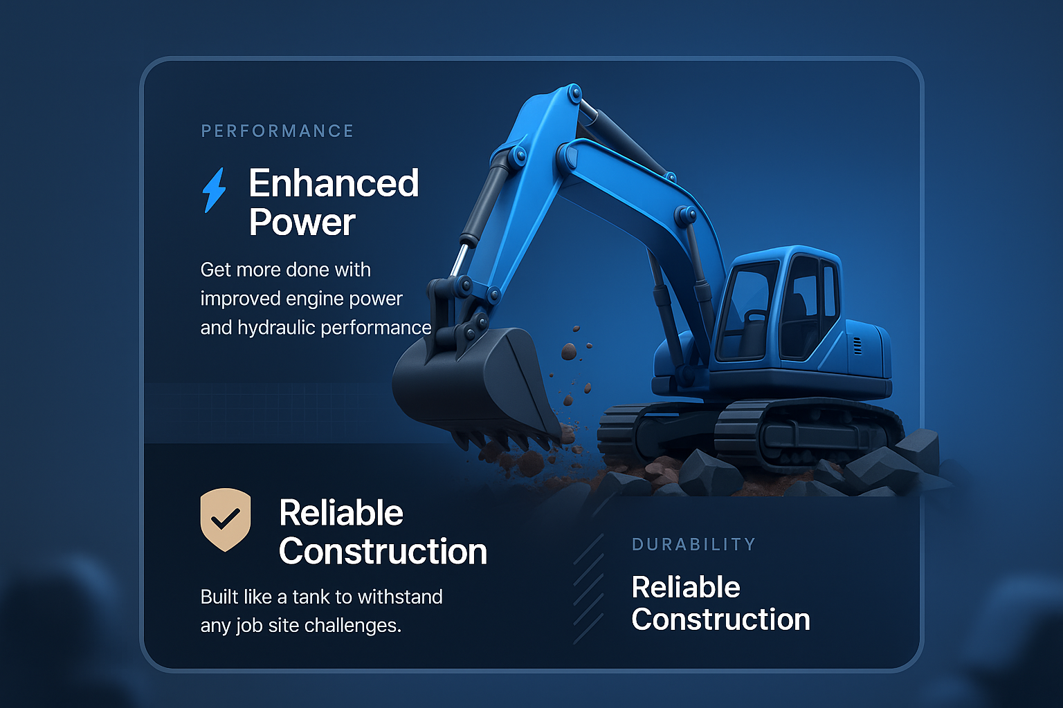 /Collection: , /by davooda/Type: PNG/A 3D illustration of a blue excavator showcasing enhanced power and durability. The design features a gradient background and informative blocks on performance and reliability.