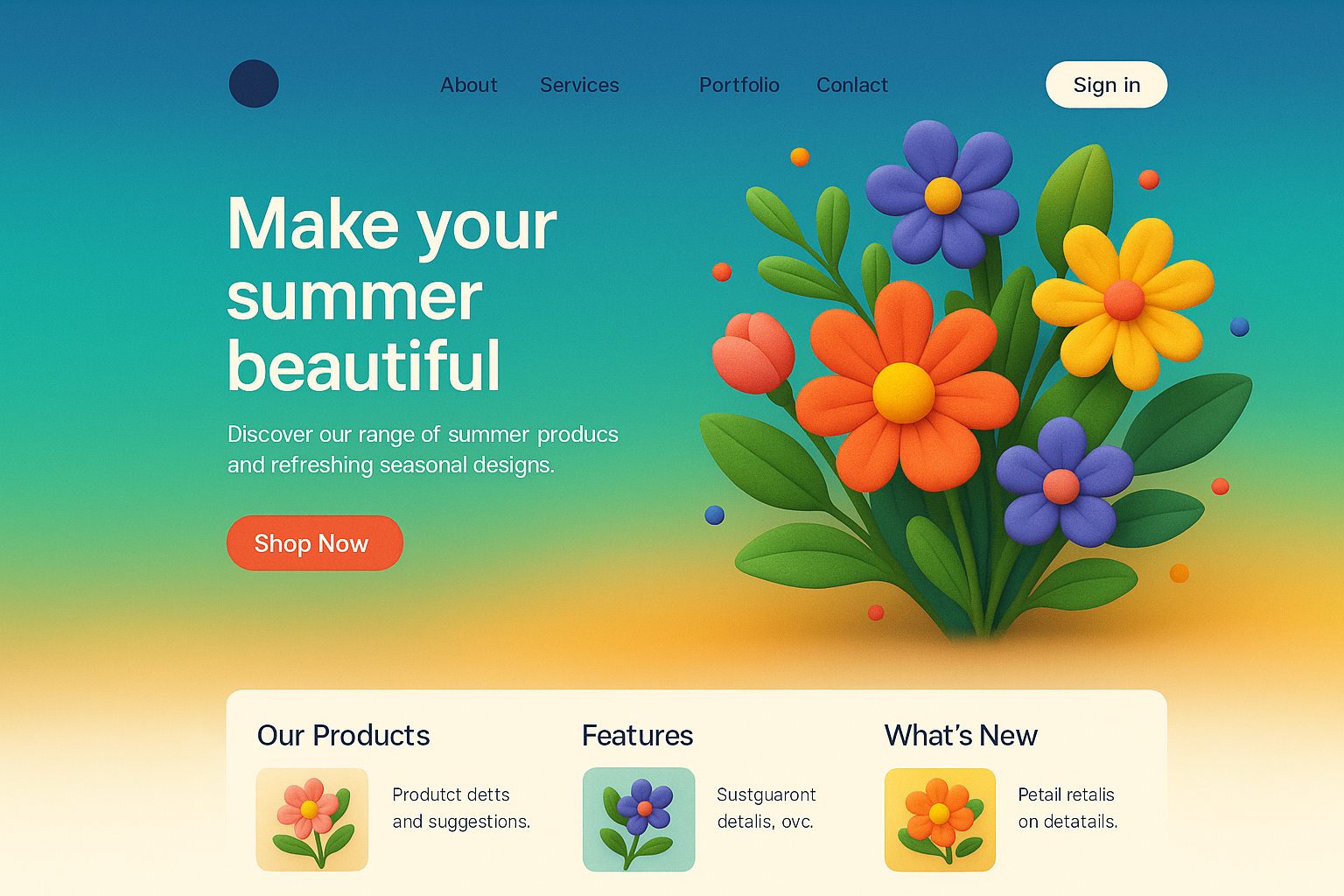 /Collection: /by davooda/Type: PNG/A vibrant 3D floral landing page showcasing colorful flowers and leaves. The design features a summer theme, with sections for products, features, and new arrivals, all presented in a visually appealing layout.