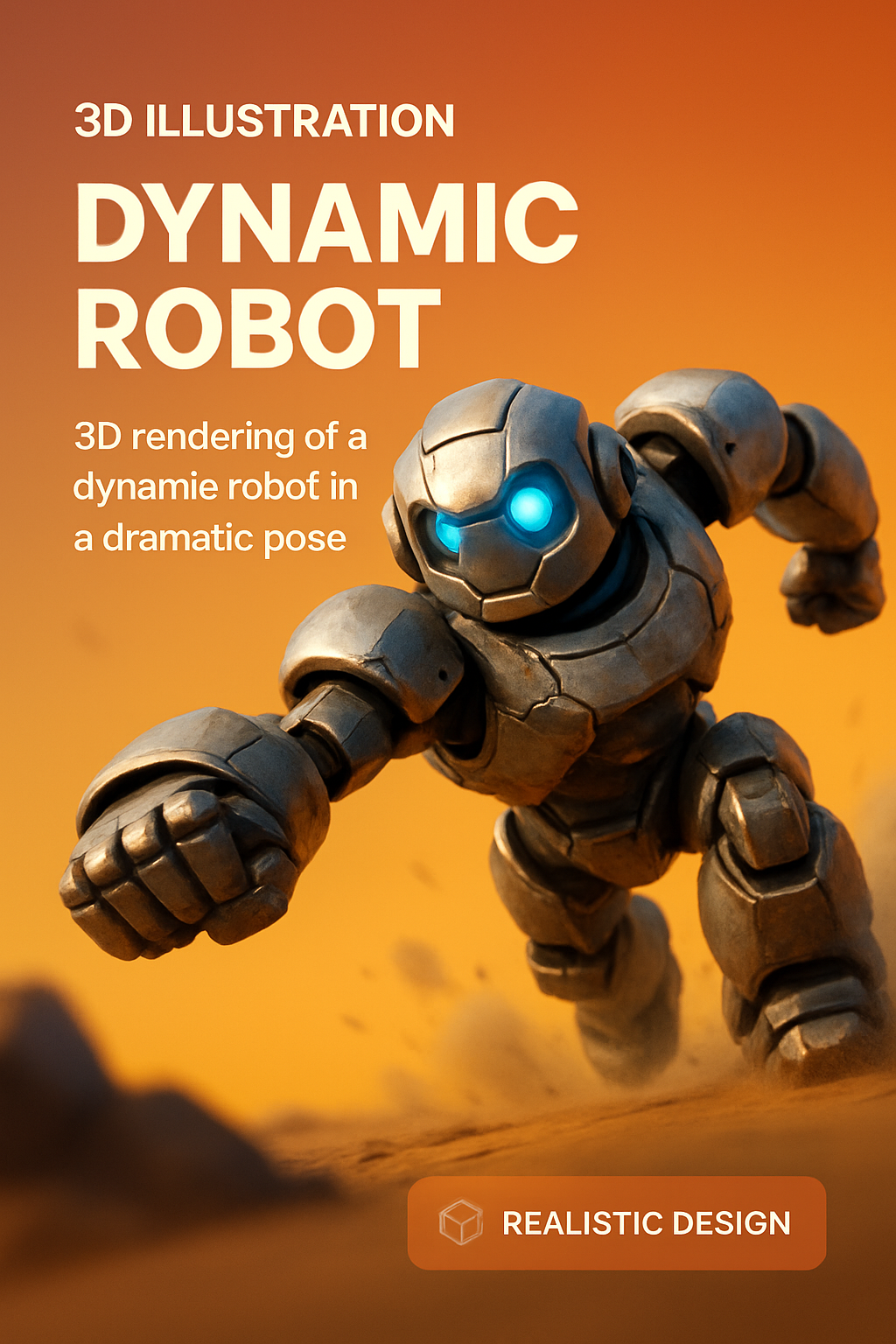 A high-quality 3D rendering of a dynamic robot in a dramatic action pose. This illustration showcases realistic design elements and is suitable for tech-related projects.