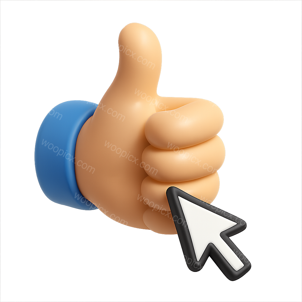 A stylized 3D thumbs up icon featuring a cursor, presented in a three-quarter isometric view. The design emphasizes volumetric shapes and a transparent background.