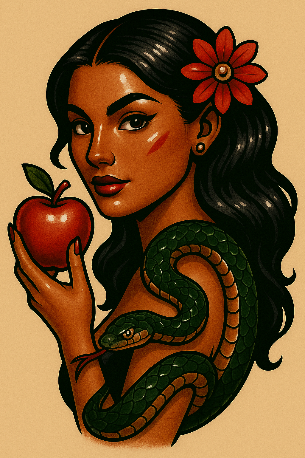 Stylized Woman with Snake and Apple in Tattoo Art Style