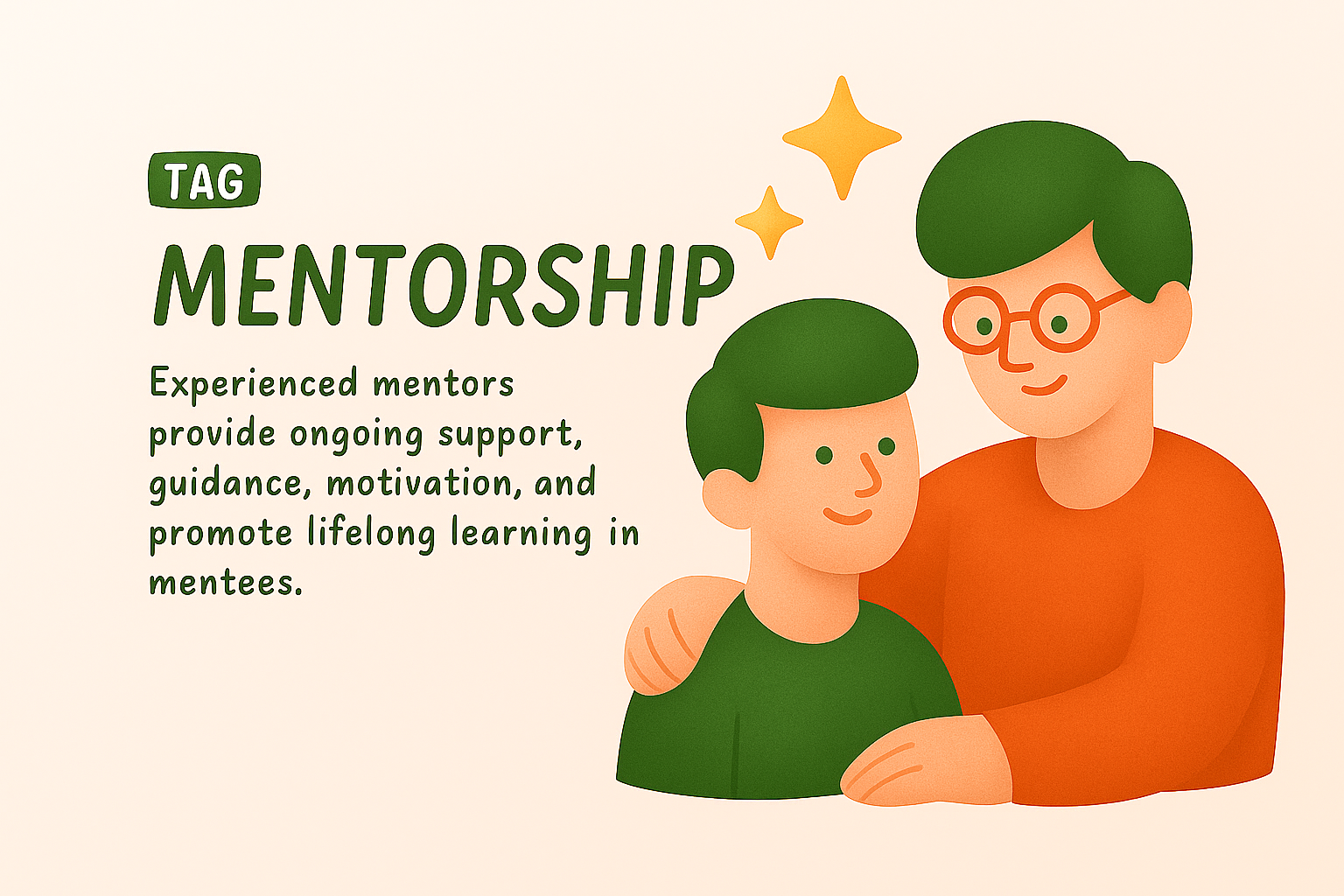 A vibrant digital illustration representing the theme of mentorship, featuring supportive characters and a warm color palette, suitable for educational purposes or promotional content.