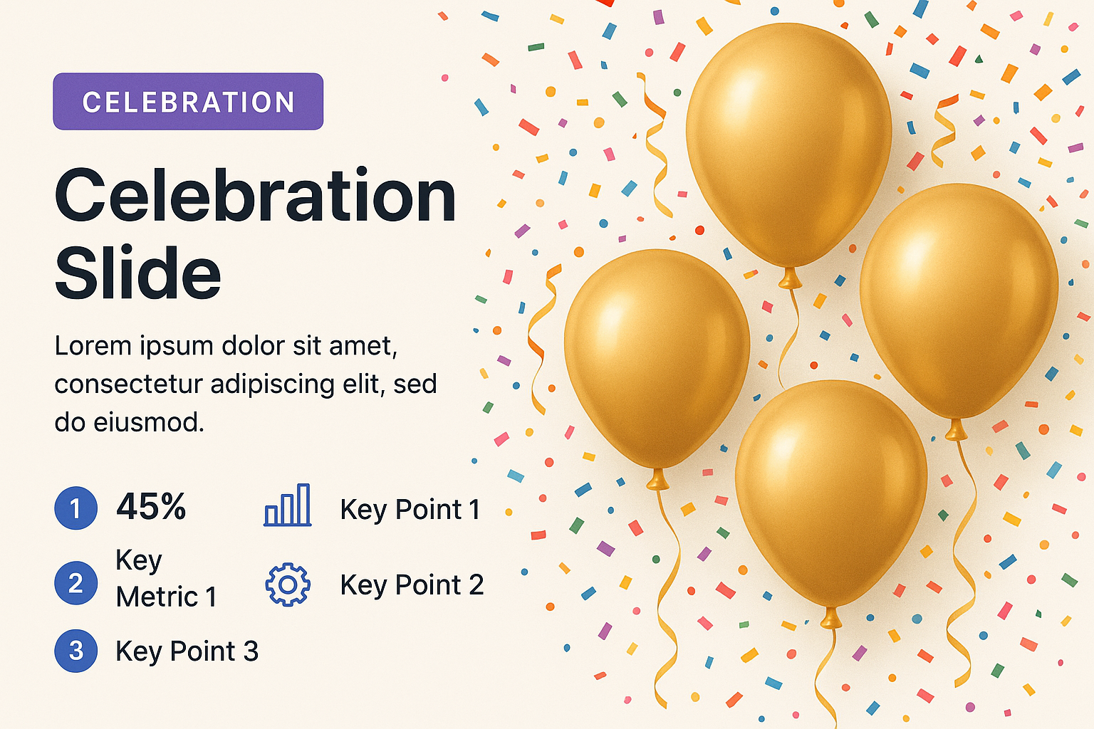 A vibrant celebration-themed slide featuring golden balloons and colorful confetti, ideal for festive presentations or event invitations.