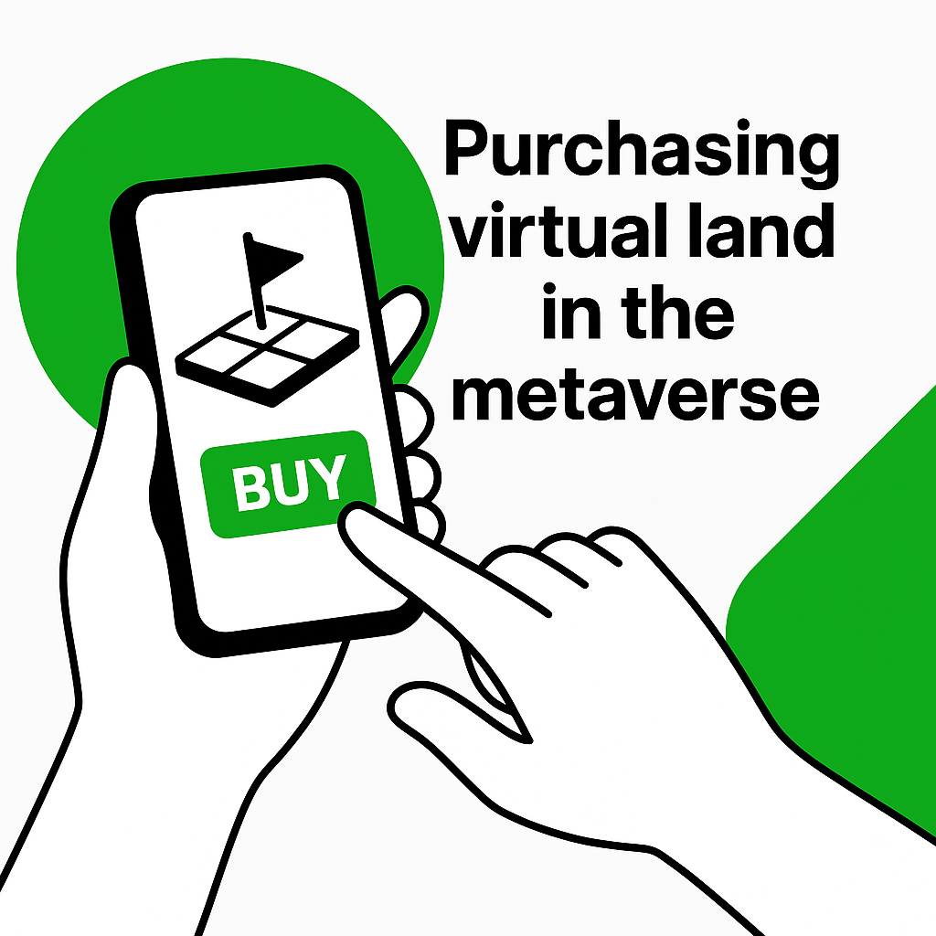 /Collection: /by davooda/Type: PNG/A digital illustration depicting hands holding a smartphone displaying a virtual land purchase interface, suitable for tech and real estate marketing in the metaverse.