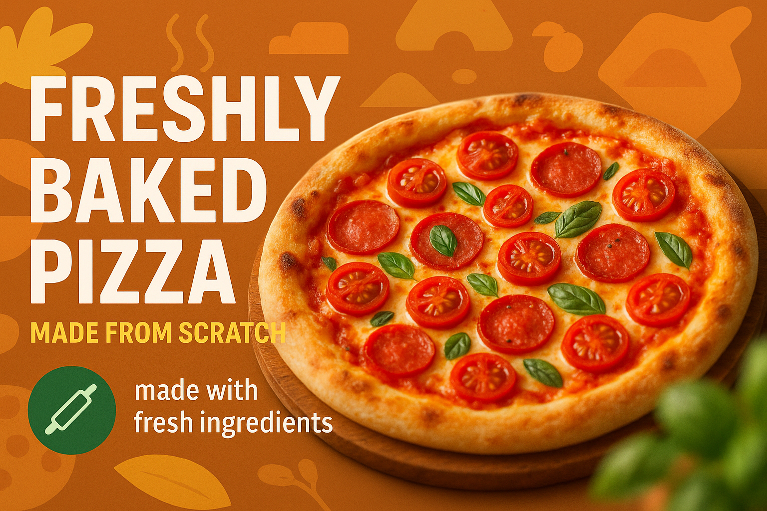 Vibrant promotional image showcasing a freshly baked pizza with toppings, ideal for food advertising or restaurant marketing.