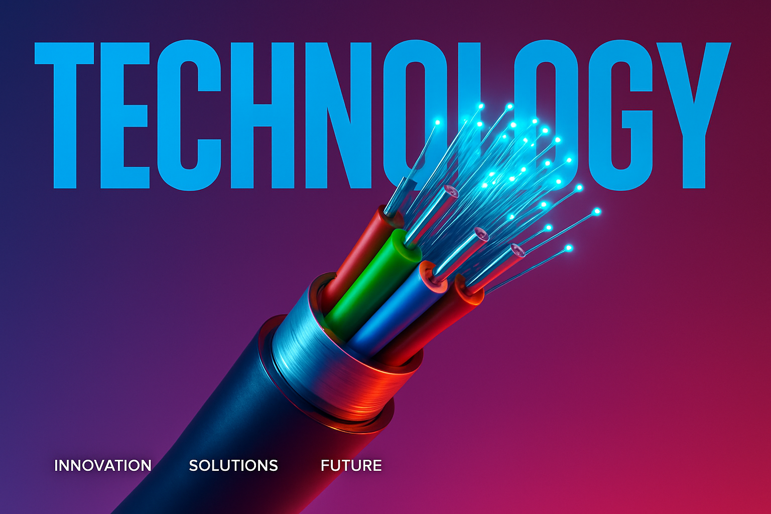 /Collection: /by davooda/Type: PNG/This image showcases a striking 3D rendering of colored electric cables with glowing LED accents, emphasizing modern technology trends against a gradient background. The bold headline 'TECHNOLOGY' dominates the upper half, balanced by subtle text elements at the bottom.