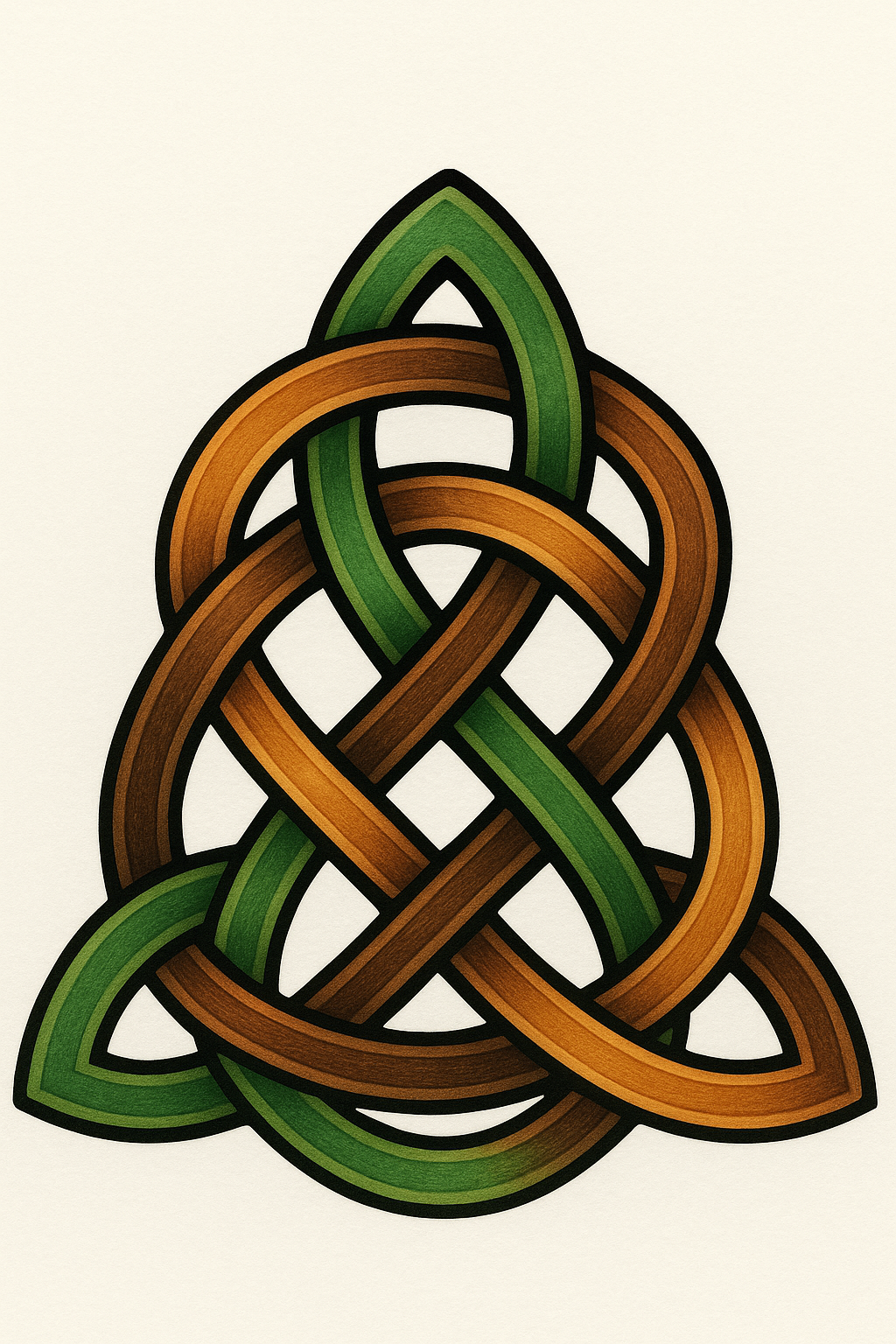 Stylized Celtic knot illustration featuring intertwining lines in earthy green and brown hues, suitable for cultural art displays or tattoo designs.