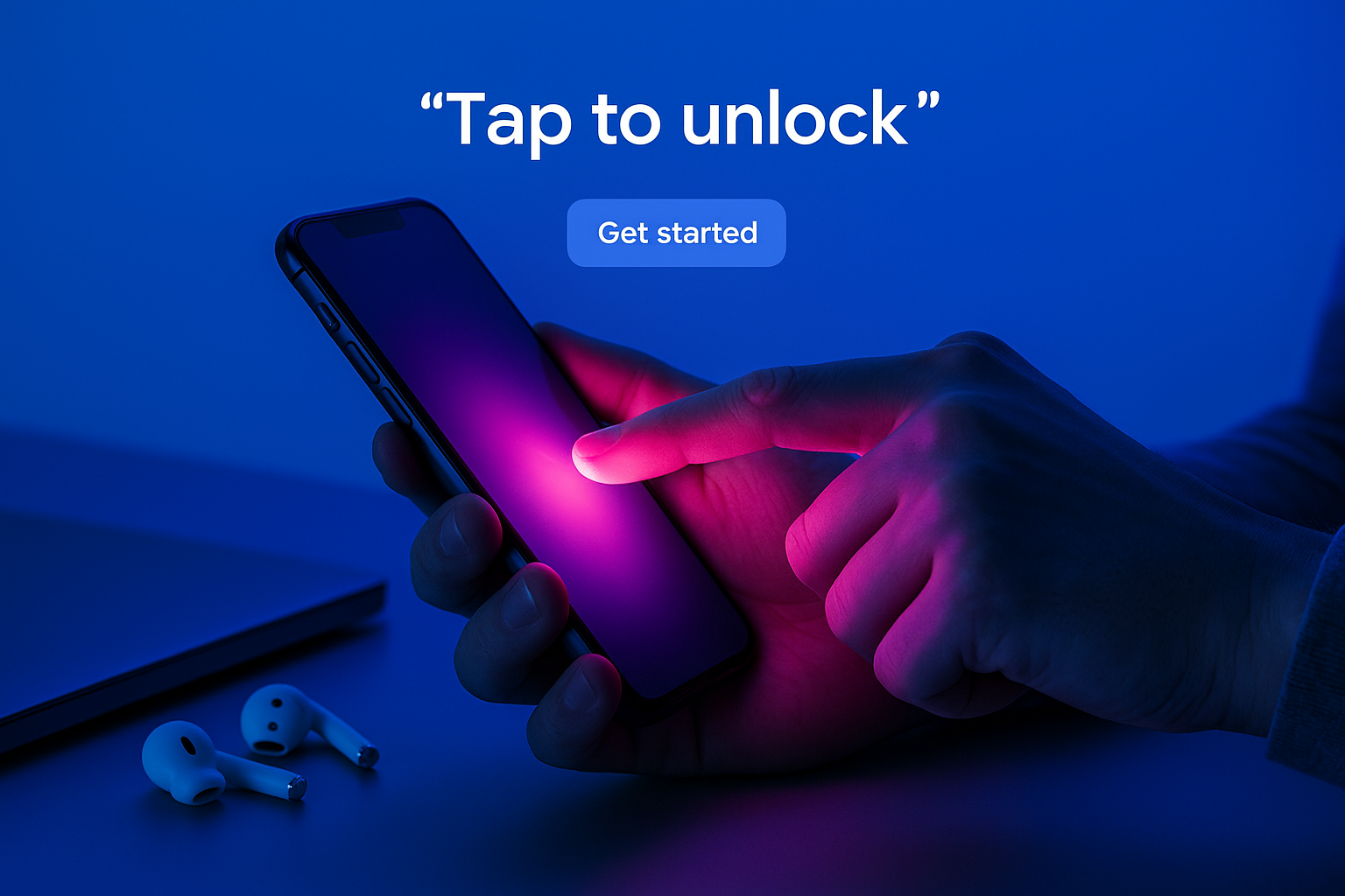 /Collection: /by davooda/Type: PNG/A hand holding a phone with a glowing touchscreen in vibrant neon pink. The background is a solid blue, creating a cool atmosphere that enhances the glowing effect.