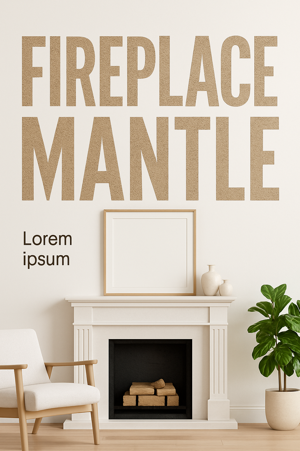 Stylish interior scene featuring a decorative fireplace mantle with large text, ideal for home decor inspiration and design showcases.