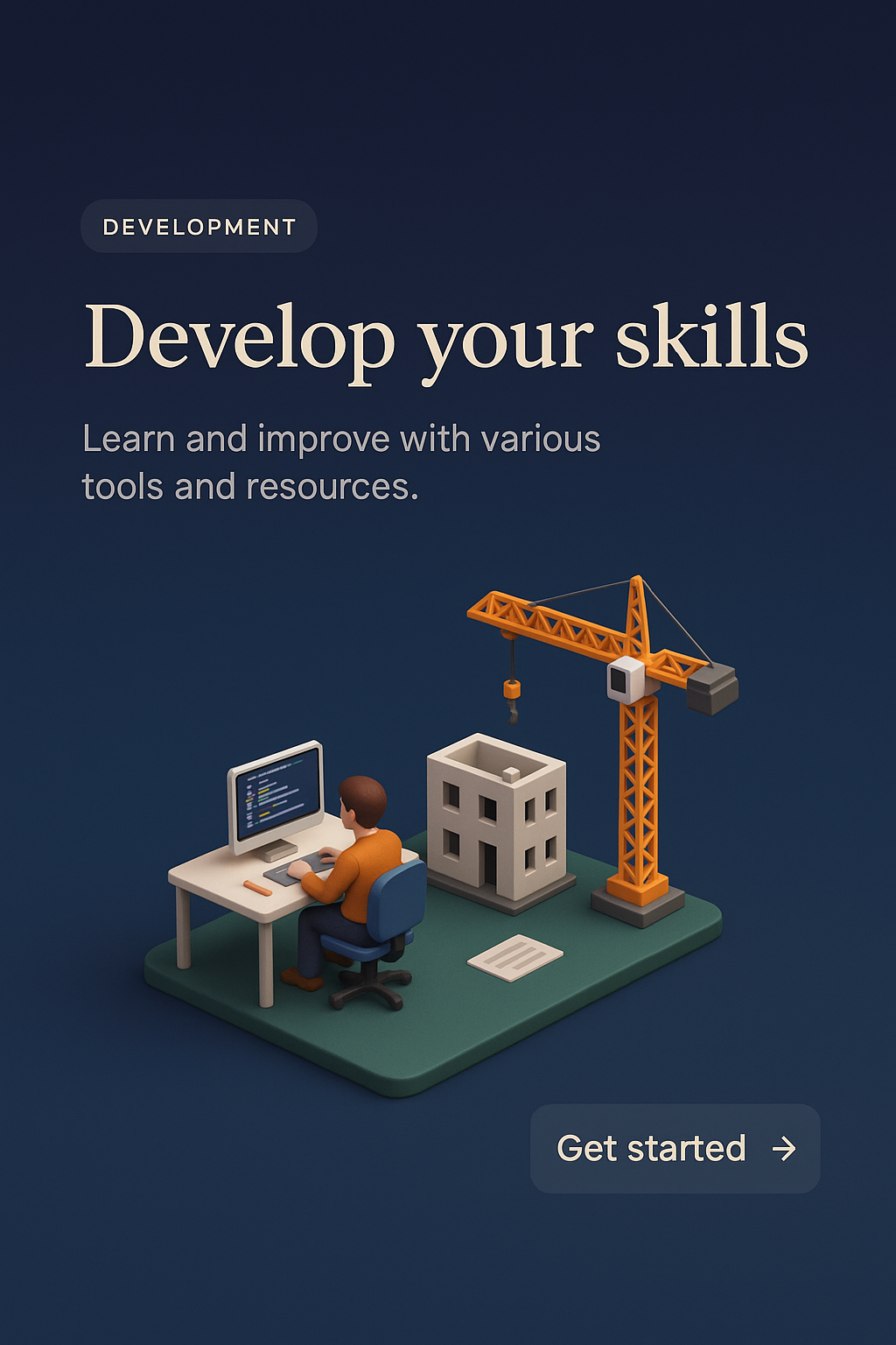 /Collection: /by davooda/Type: PNG/A visually engaging 3D scene showcasing a person working at a desk with a construction crane and building. The dark gradient background highlights the vibrant elements, emphasizing skill development.