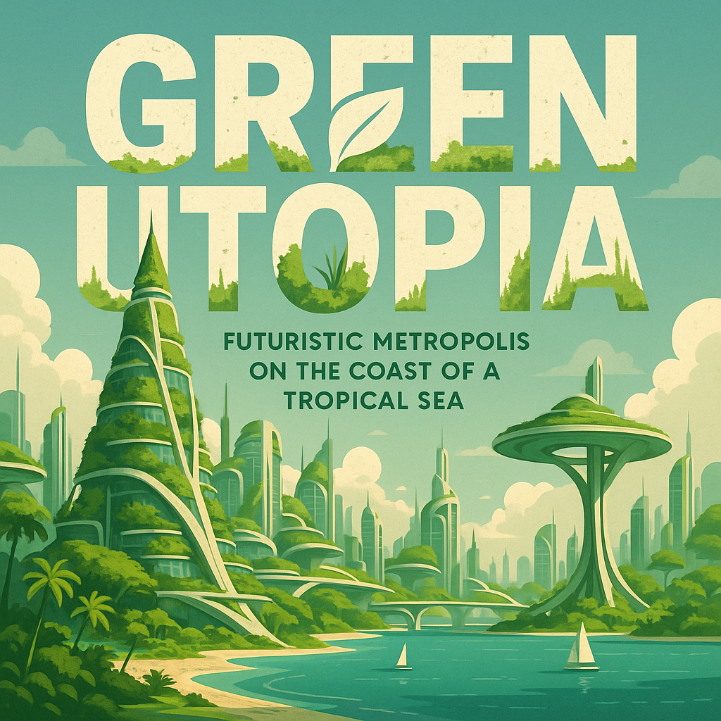 /Collection: /by davooda/Type: PNG/Vibrant and imaginative illustration depicting a futuristic metropolis surrounded by lush greenery and a tropical sea, perfect for eco-themed projects or discussions on sustainable living.