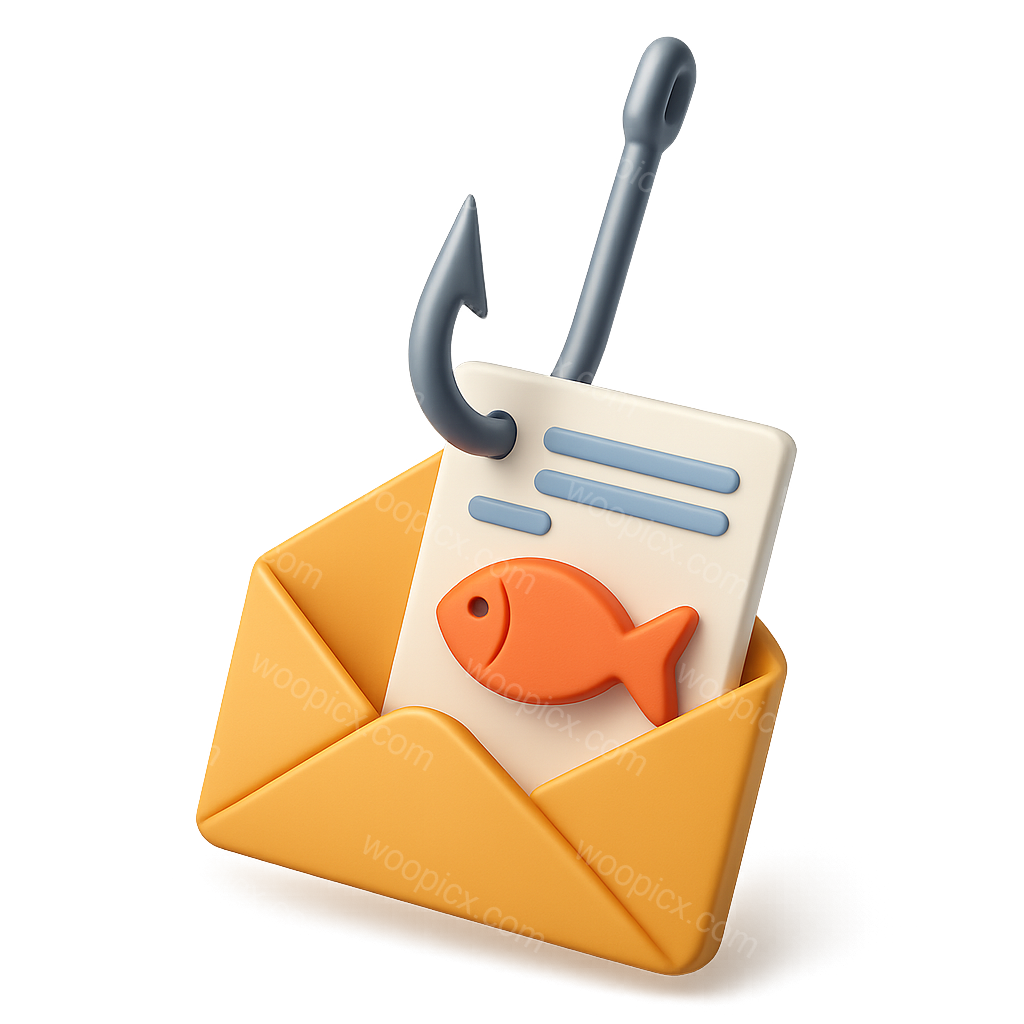 A vibrant 3D icon depicting a phishing attempt. It features a fish symbol and a hook emerging from a stylized envelope, all presented in an isometric, volumetric style with a transparent background.