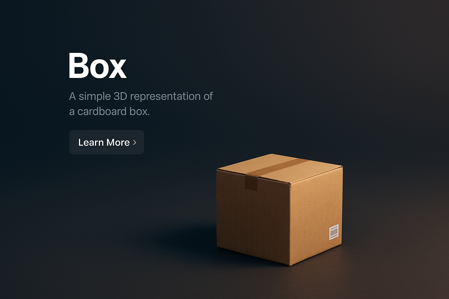 A realistic 3D representation of a cardboard box set against a dark gradient background. The scene includes a simple text block and a call-to-action button.