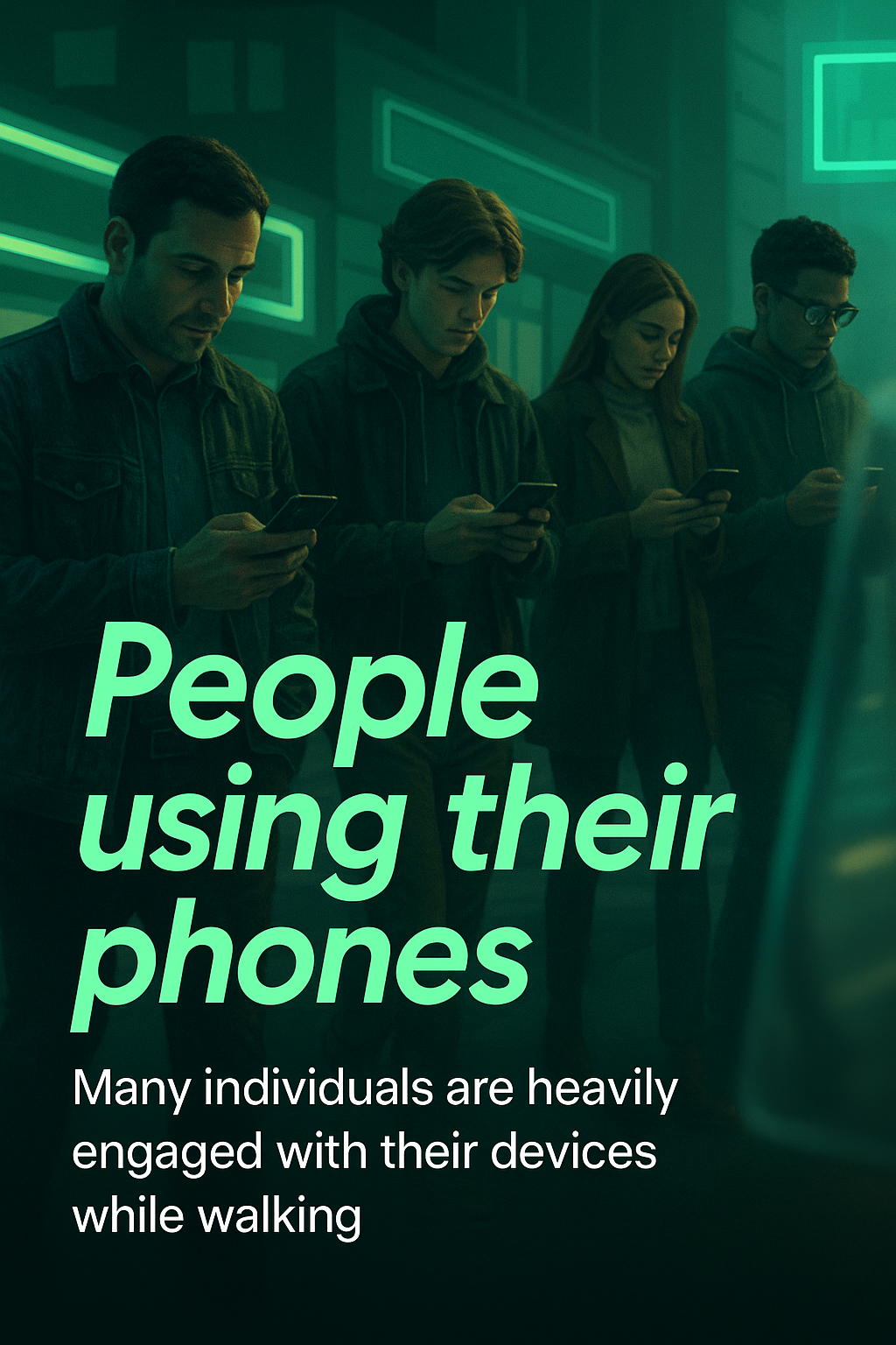 /Collection: /by davooda/Type: PNG/A modern illustration capturing a group of individuals focused on their smartphones while walking in an urban environment, featuring a cool color palette and contemporary design elements suitable for tech-related content.