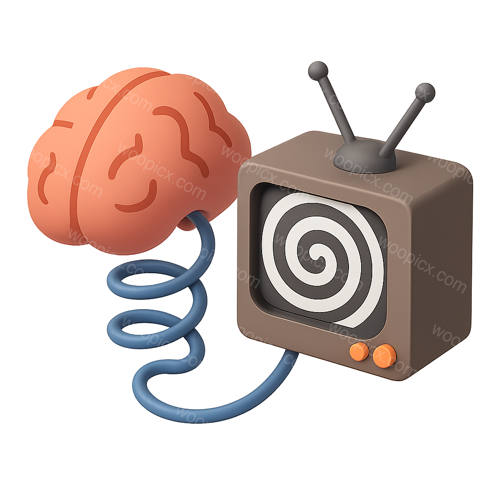 A creative 3D representation of a brain connected to a retro TV with a spiral pattern, set against a soft gradient background. The design emphasizes a whimsical and isometric style.