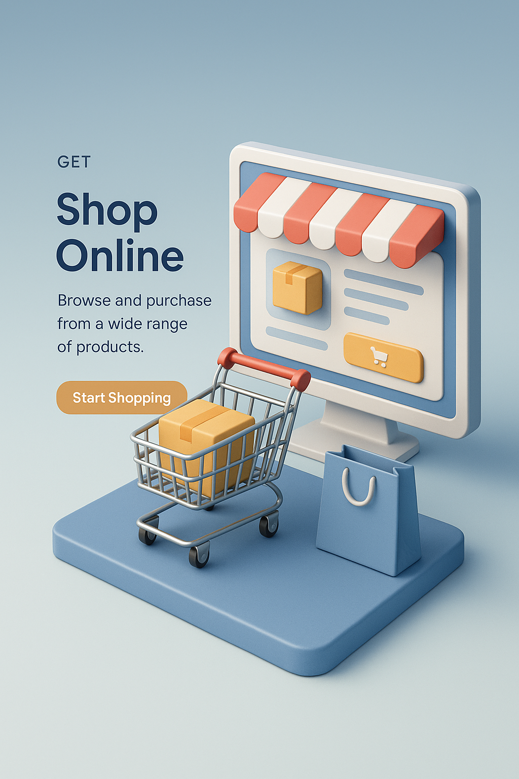 /Collection: /by davooda/Type: PNG/A detailed 3D illustration depicting an online shopping scene. It includes a shopping cart with products, a computer screen displaying a shopping interface, and a cohesive color scheme.