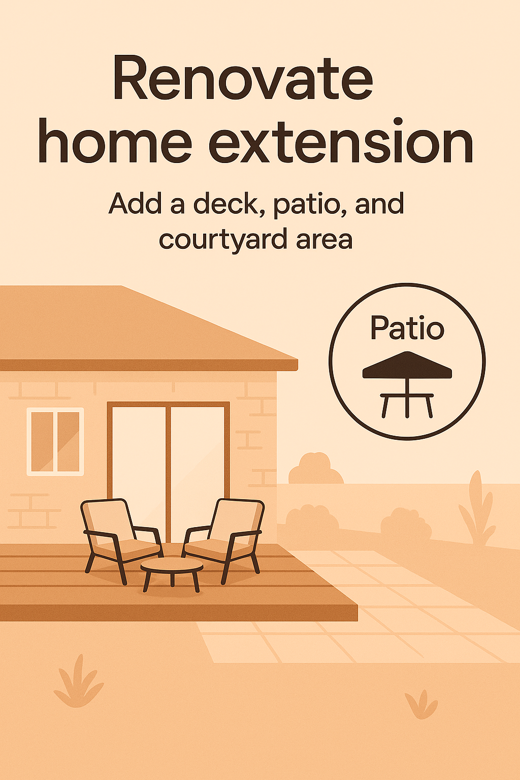 /Collection: /by davooda/Type: PNG/Stylish promotional graphic for home renovation featuring a modern patio setup, ideal for marketing outdoor living spaces. The design uses warm tones and minimalist elements.