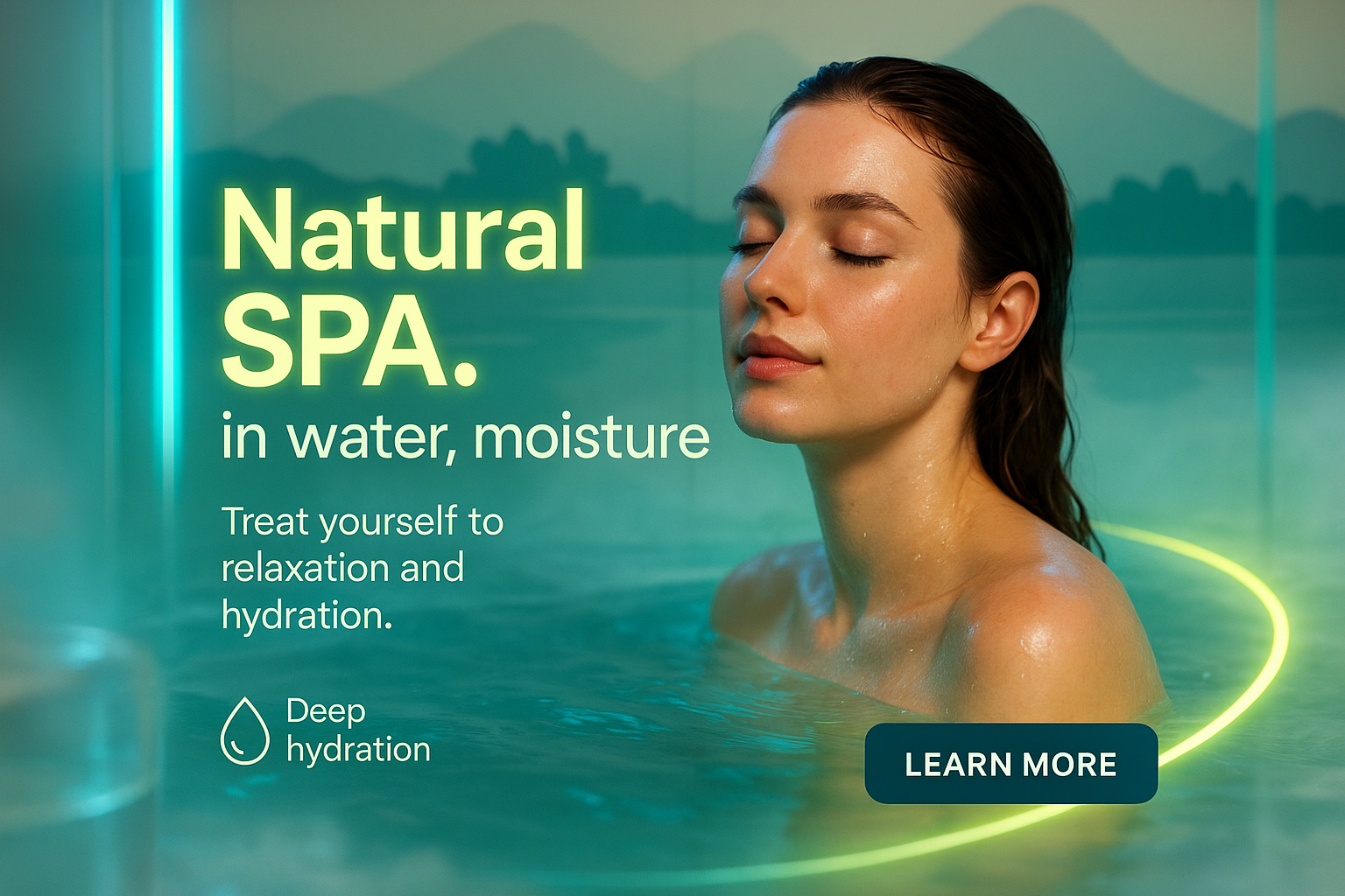 Inviting promotional graphic for a natural spa experience featuring soothing colors and a serene atmosphere, ideal for wellness marketing.