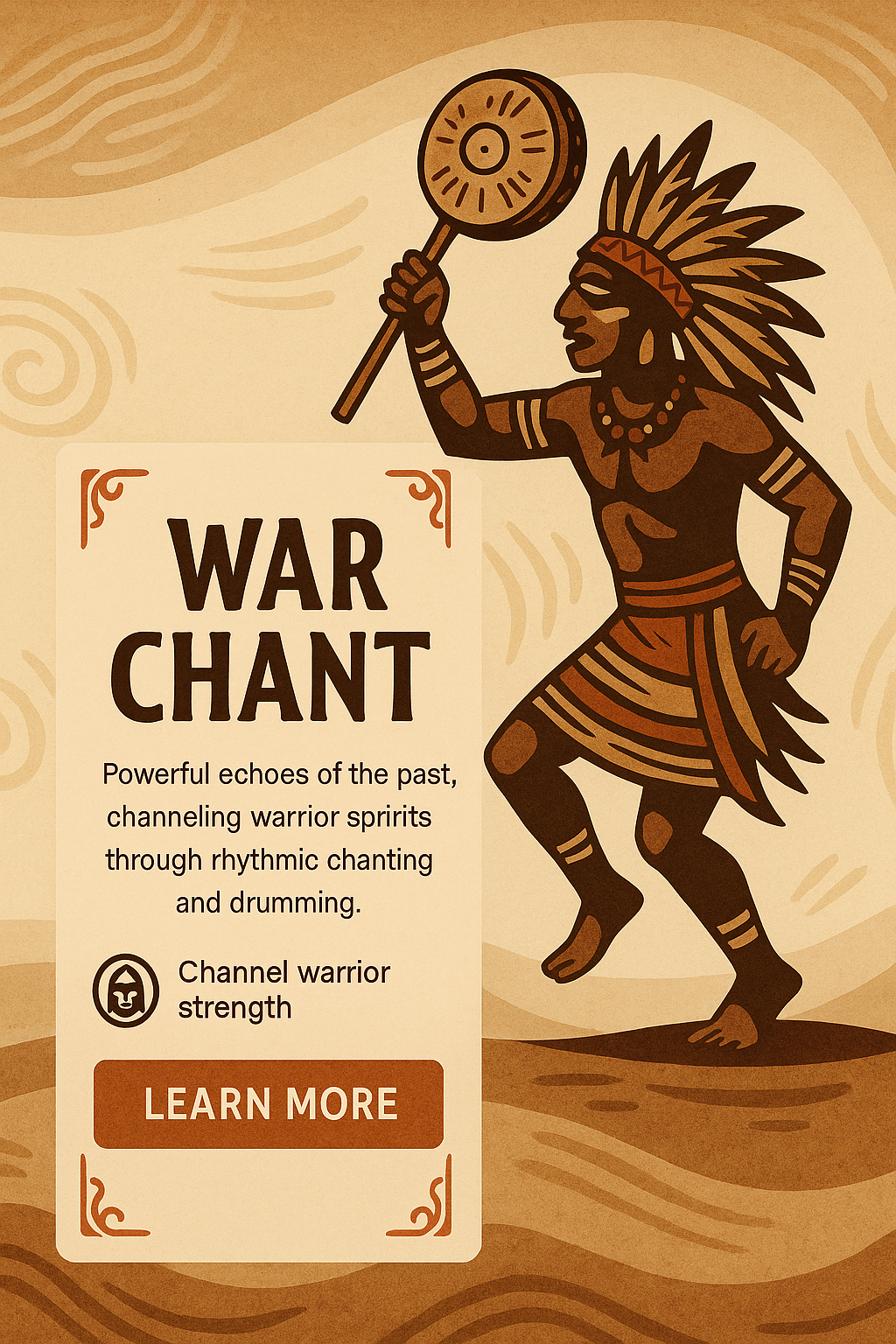 A visually engaging landing page slide featuring a warrior figure with a traditional drum. The design blends boho aesthetics with a clear focus on the 'War Chant' theme, complemented by a call-to-action button.