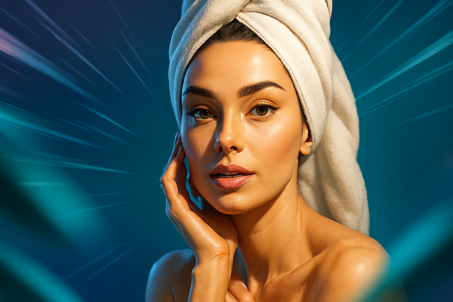 A captivating portrait of an attractive woman with a towel wrapped around her head, showcasing a striking expression against a dynamic background. The composition features vibrant colors and a sense of movement.