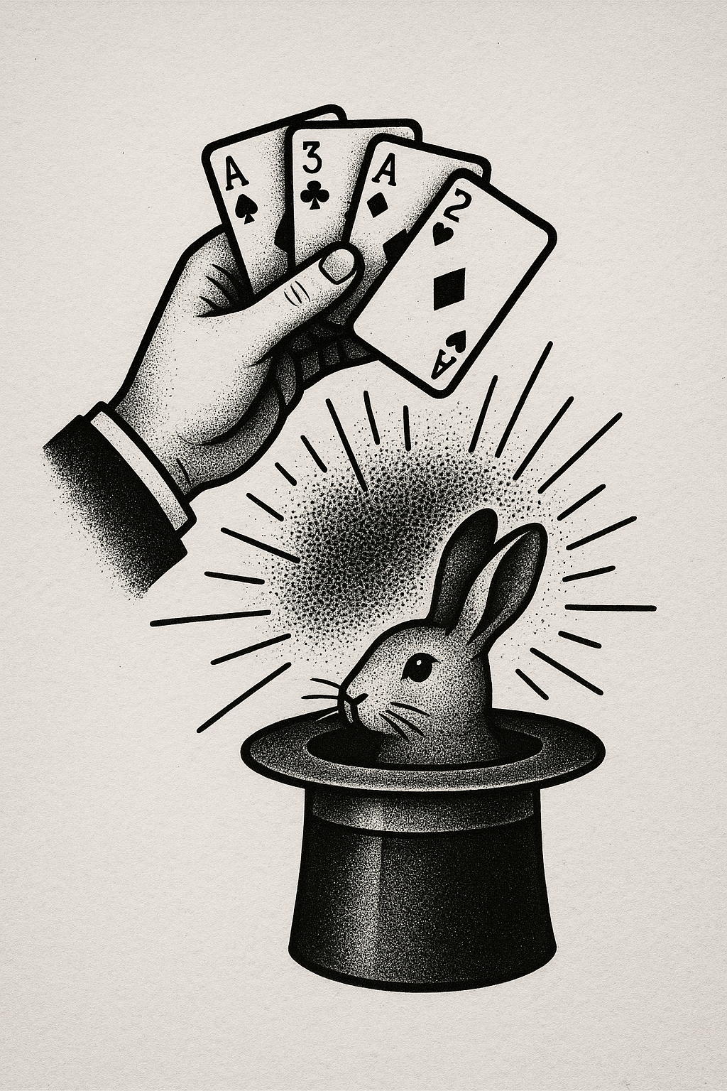 Vintage-style illustration of a magician's hand with cards and a rabbit