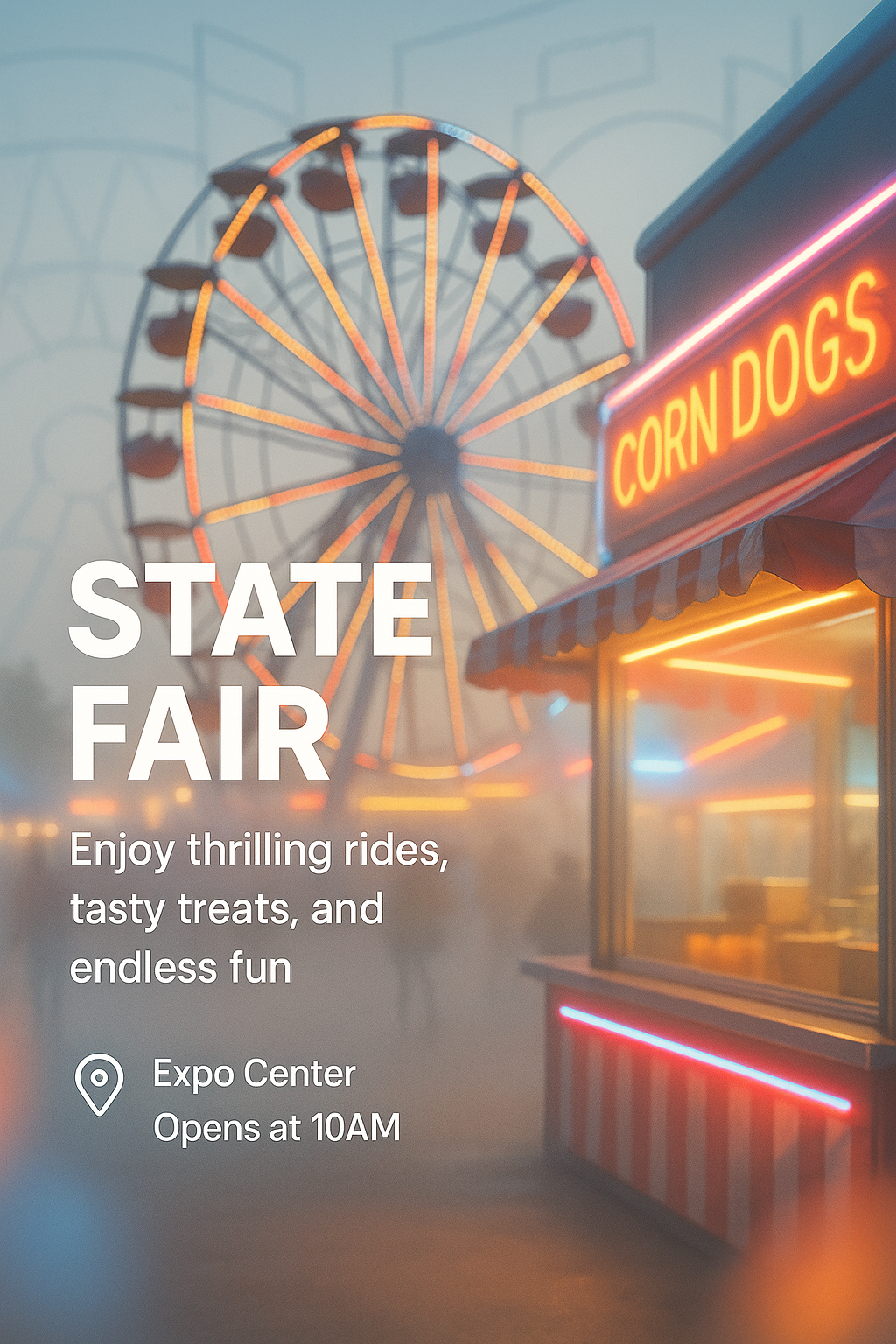 An engaging promotional image for a state fair, showcasing a ferris wheel and food stall with neon lighting. Ideal for advertising events and local attractions.