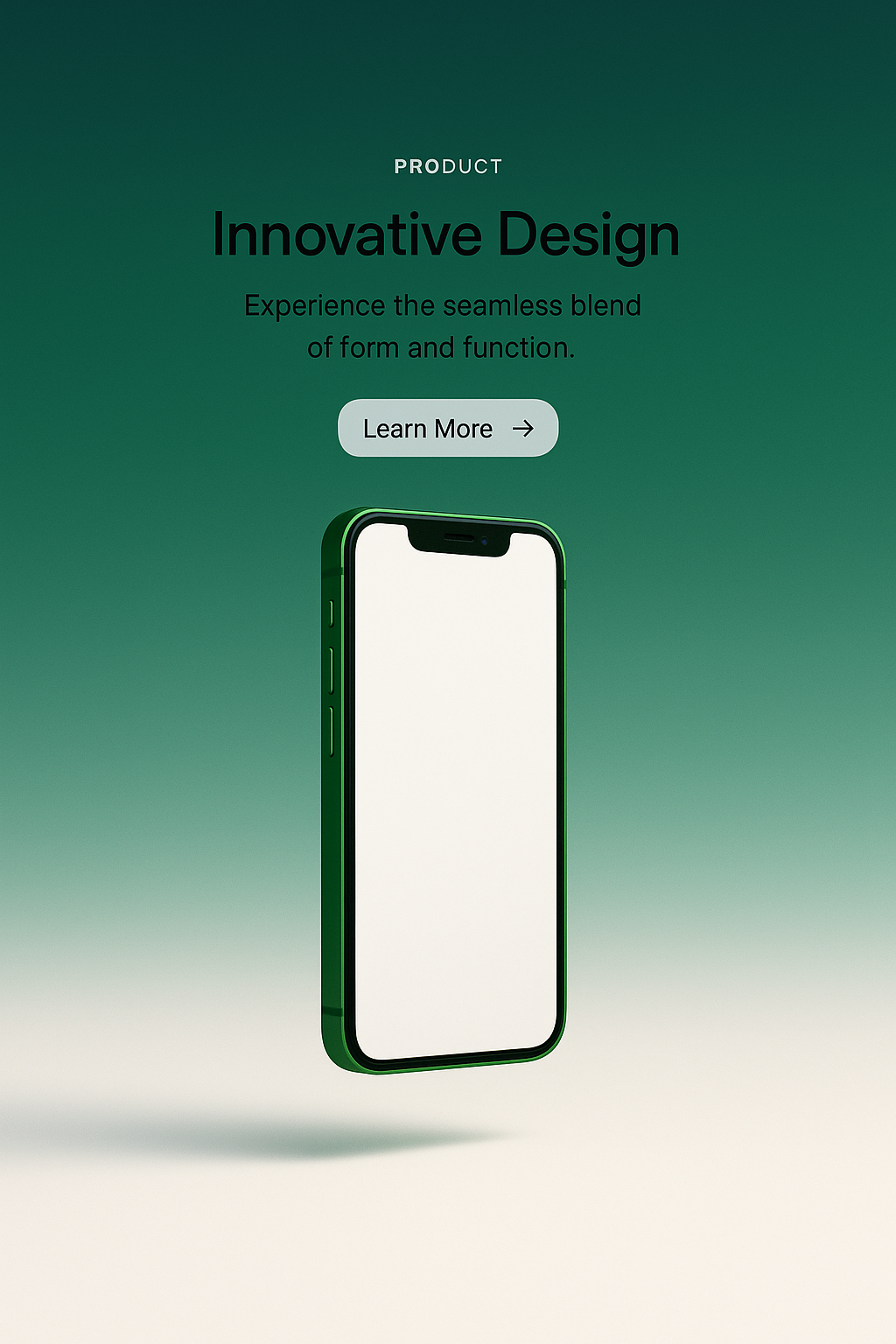 /Collection: /by davooda/Type: PNG/A sleek green smartphone appears to float against a smooth gradient background, transitioning from dark green at the top to pure white below. The design emphasizes modernity and elegance.