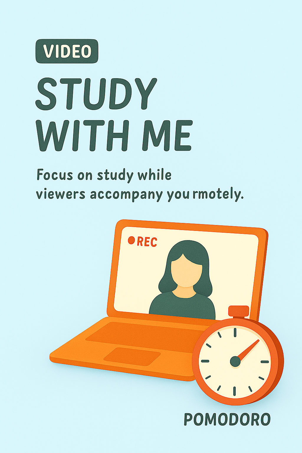 /Collection: /by davooda/Type: PNG/Colorful video thumbnail designed for a 'Study With Me' session, incorporating a laptop and a Pomodoro timer, perfect for inviting viewers to join a study routine.