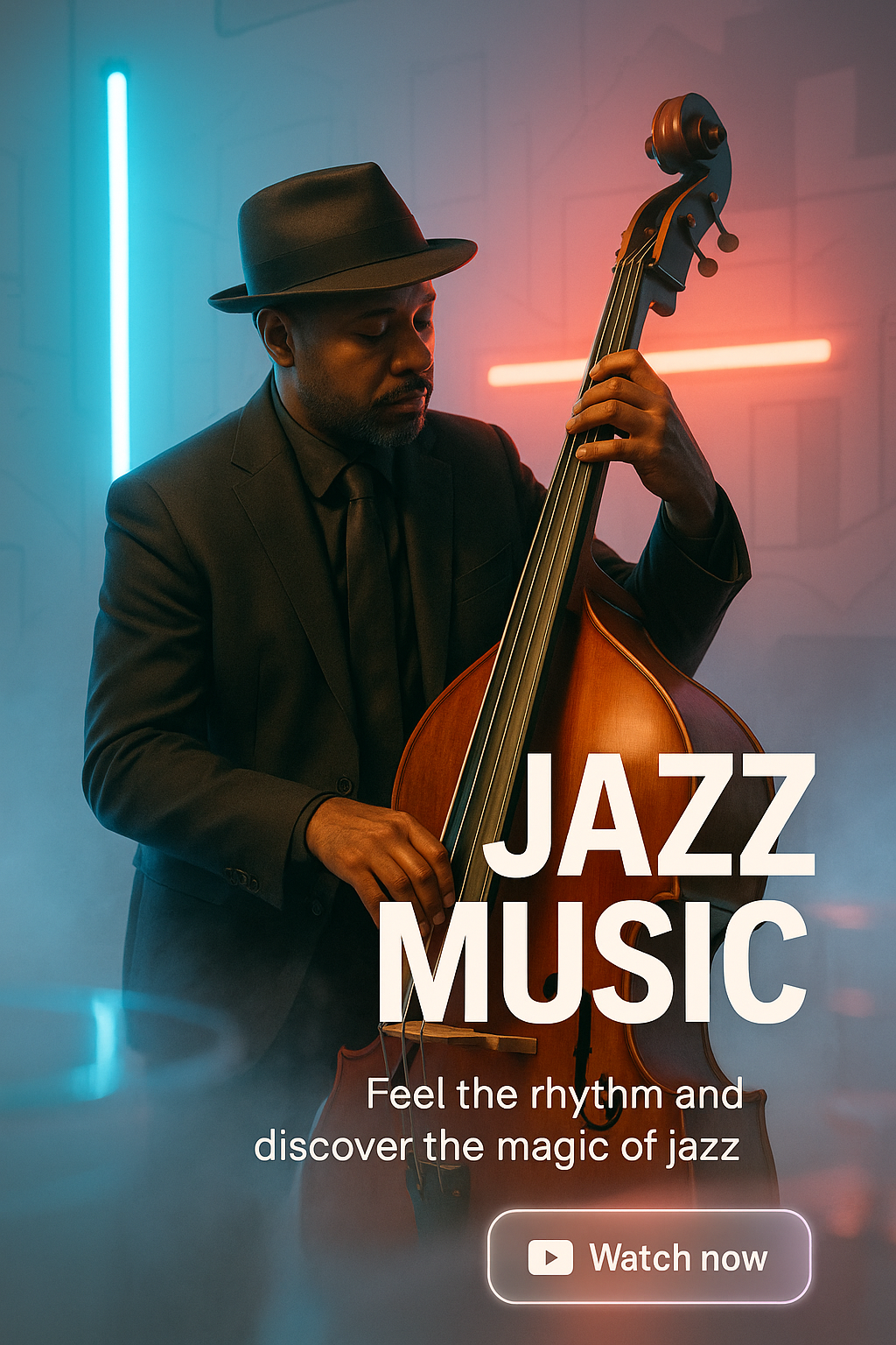Vibrant promotional image featuring a musician playing the double bass, designed to evoke the essence of jazz. Ideal for music events or streaming platforms.