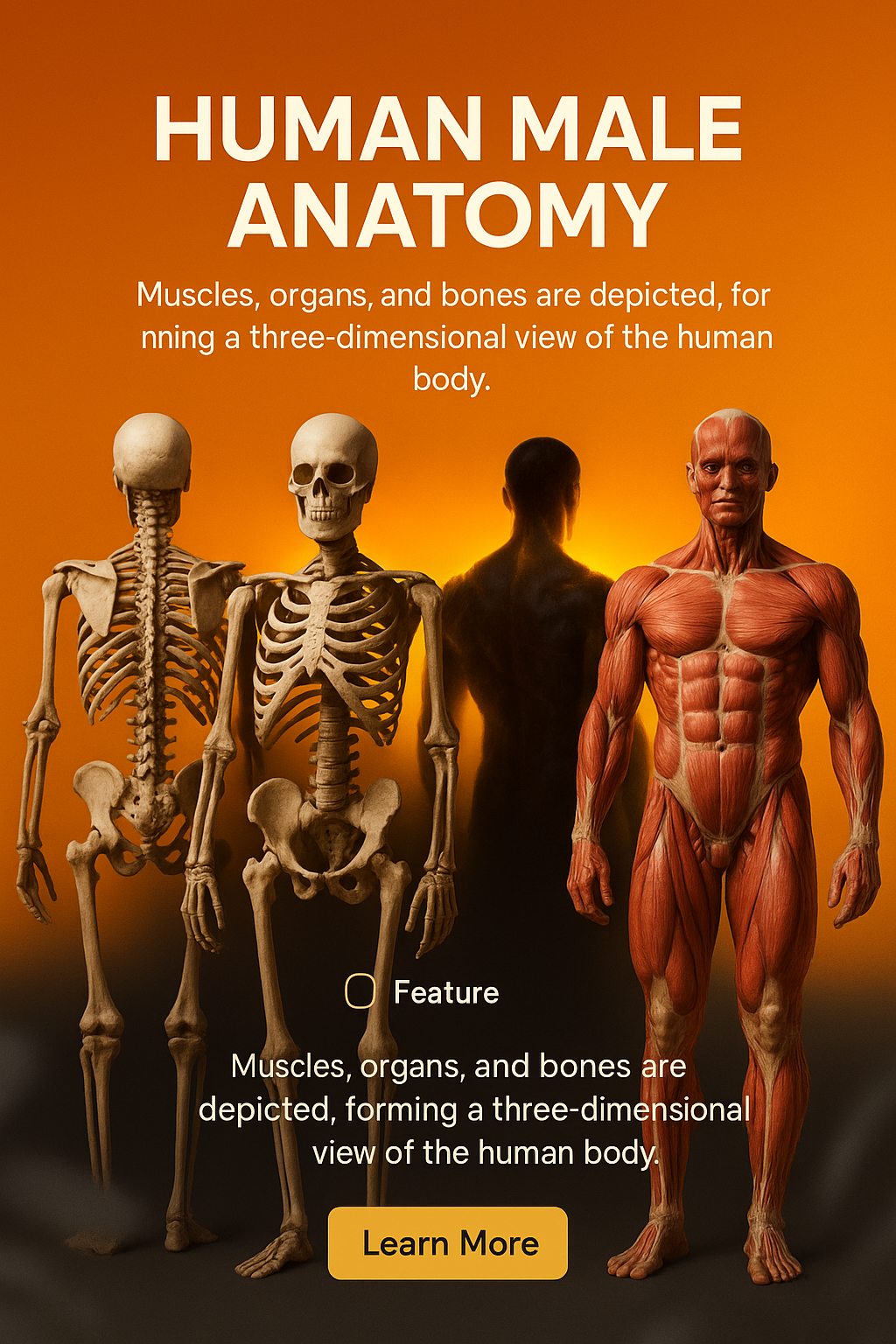 /Collection: /by davooda/Type: PNG/This infographic showcases human male anatomy, featuring detailed skeletal and muscular models. It's designed for educational use in biology or health classes.