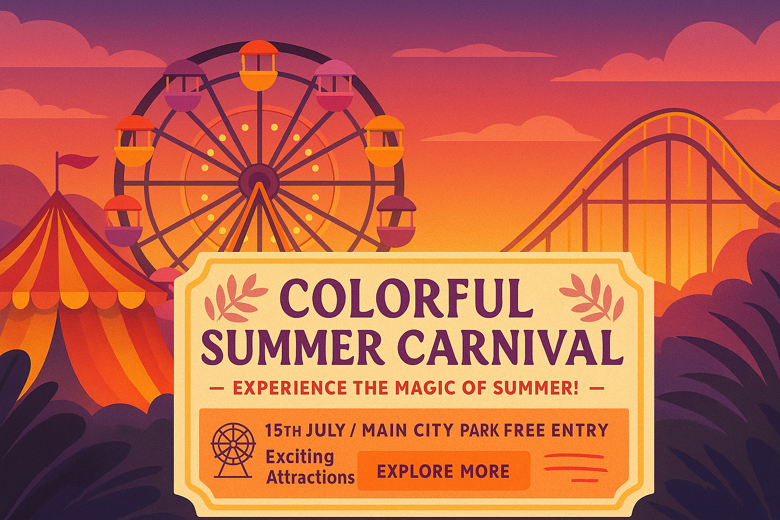 /Collection: /by davooda/Type: PNG/A colorful summer carnival scene at dusk featuring a Ferris wheel, roller coaster, and a vibrant tent. The design includes a bold announcement for the event, inviting attendees.