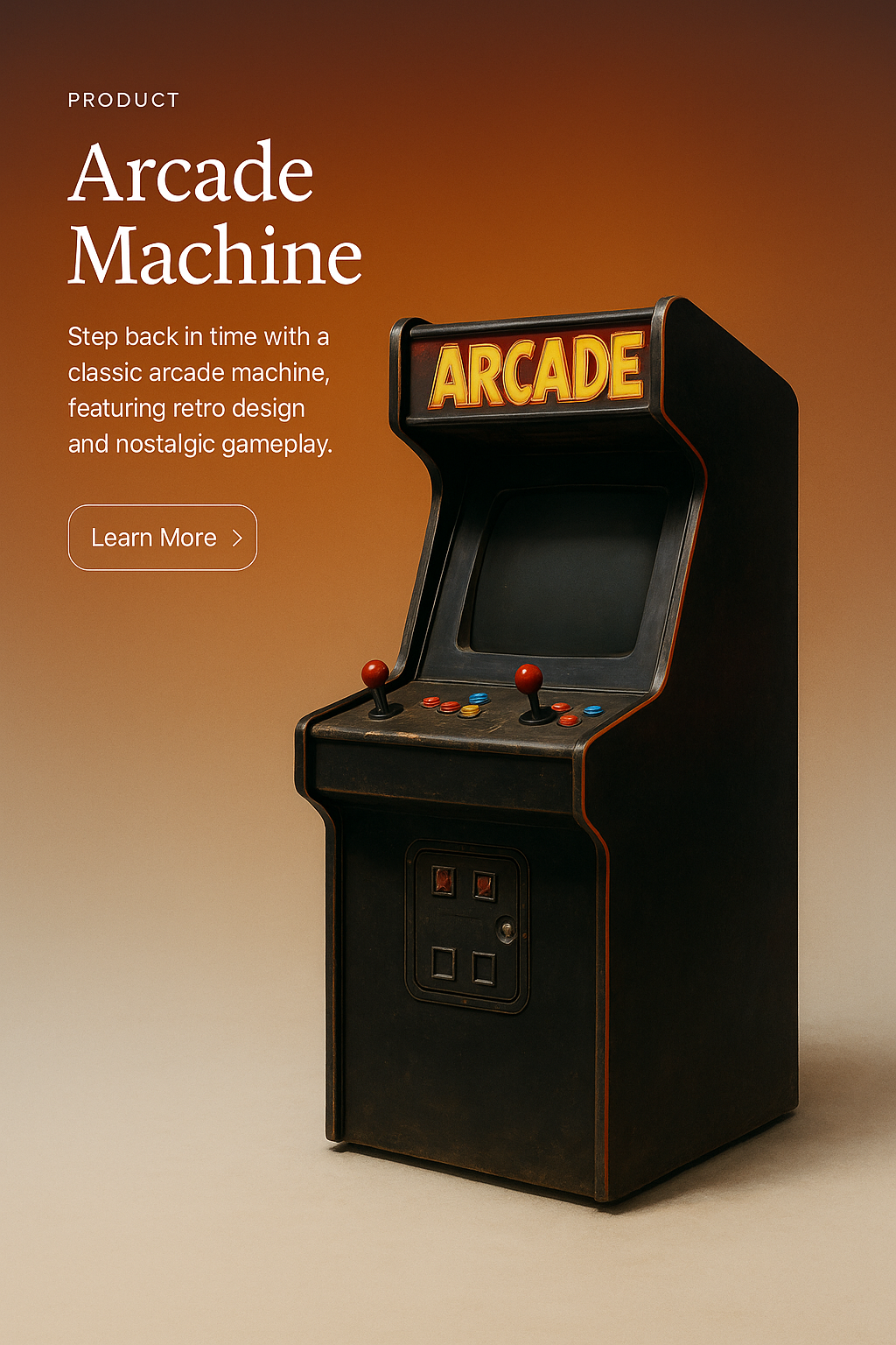 A classic arcade machine featuring retro design, set against a gradient background. Includes a call-to-action button inviting users to learn more.