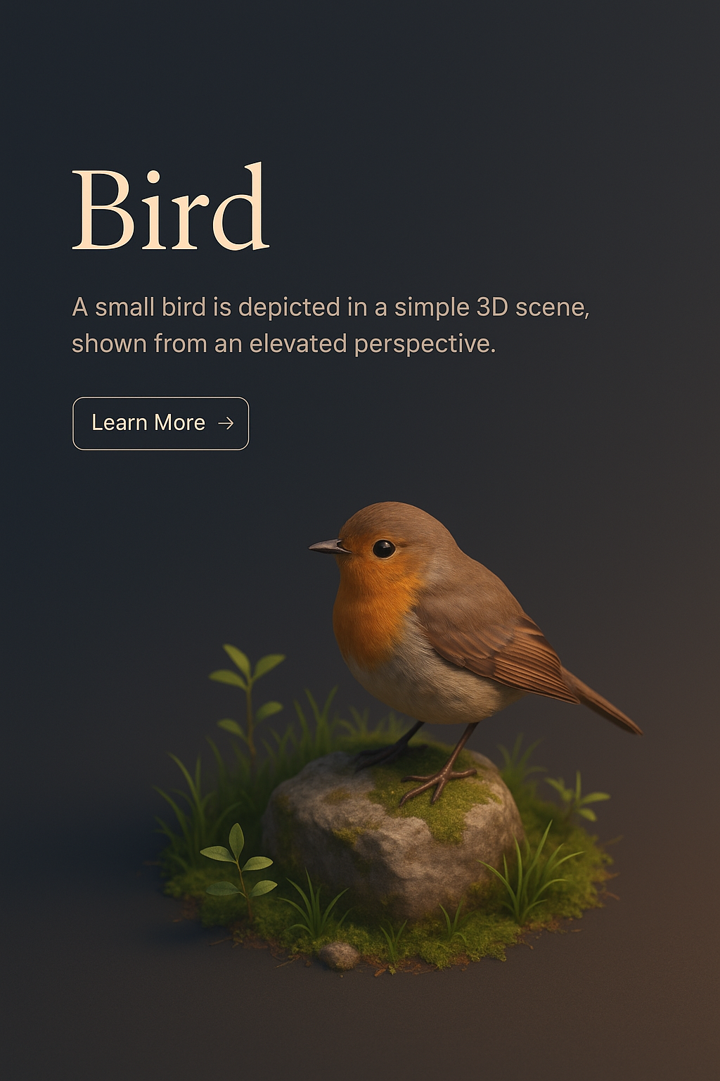 A small bird is showcased in a detailed 3D scene from an elevated perspective, featuring a dark gradient background and lush greenery.
