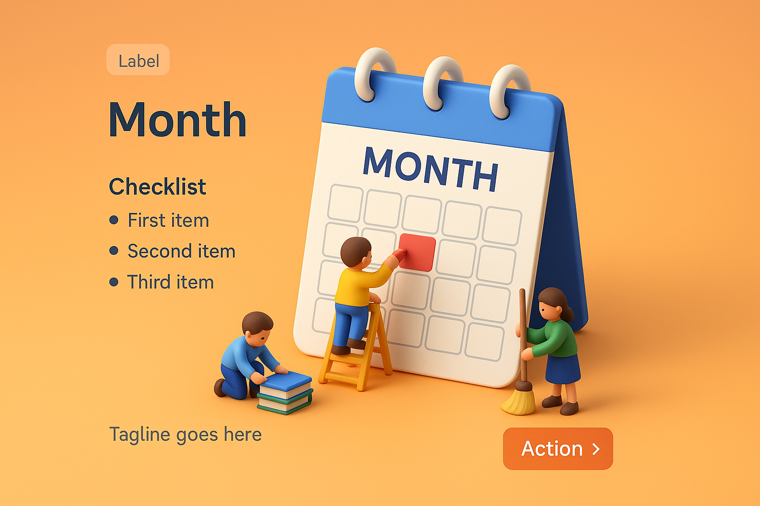 /Collection: /by davooda/Type: PNG/A vibrant 3D scene depicting tiny characters interacting with a calendar. The playful environment showcases a checklist with colorful elements, emphasizing the theme of 'month'.