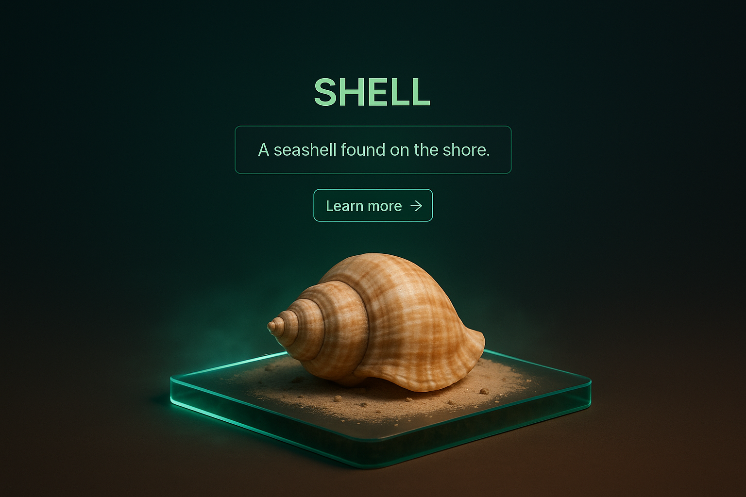 A realistic 3D depiction of a seashell on a translucent base, surrounded by a dark gradient background and glowing neon accents. Text elements are included.